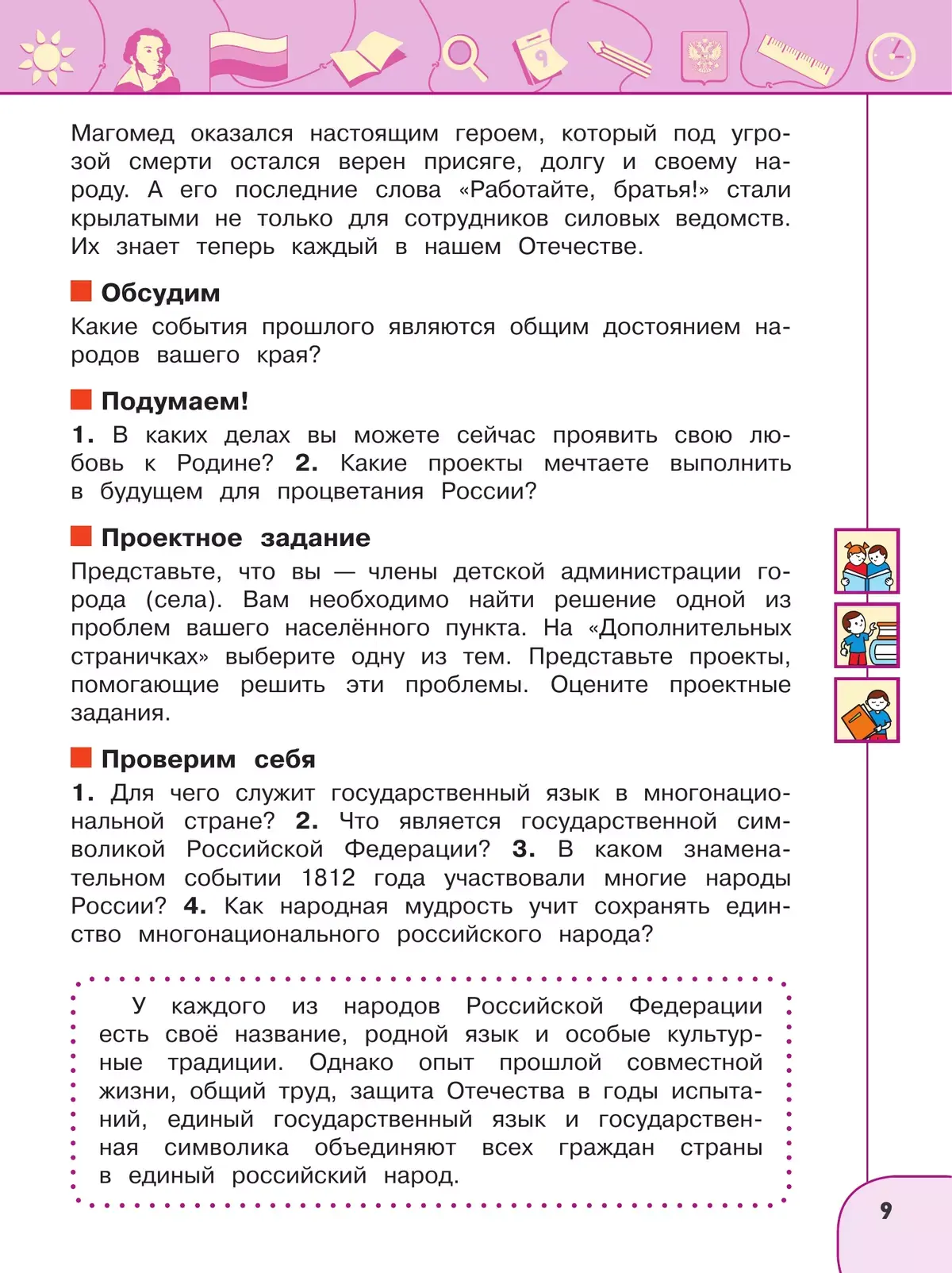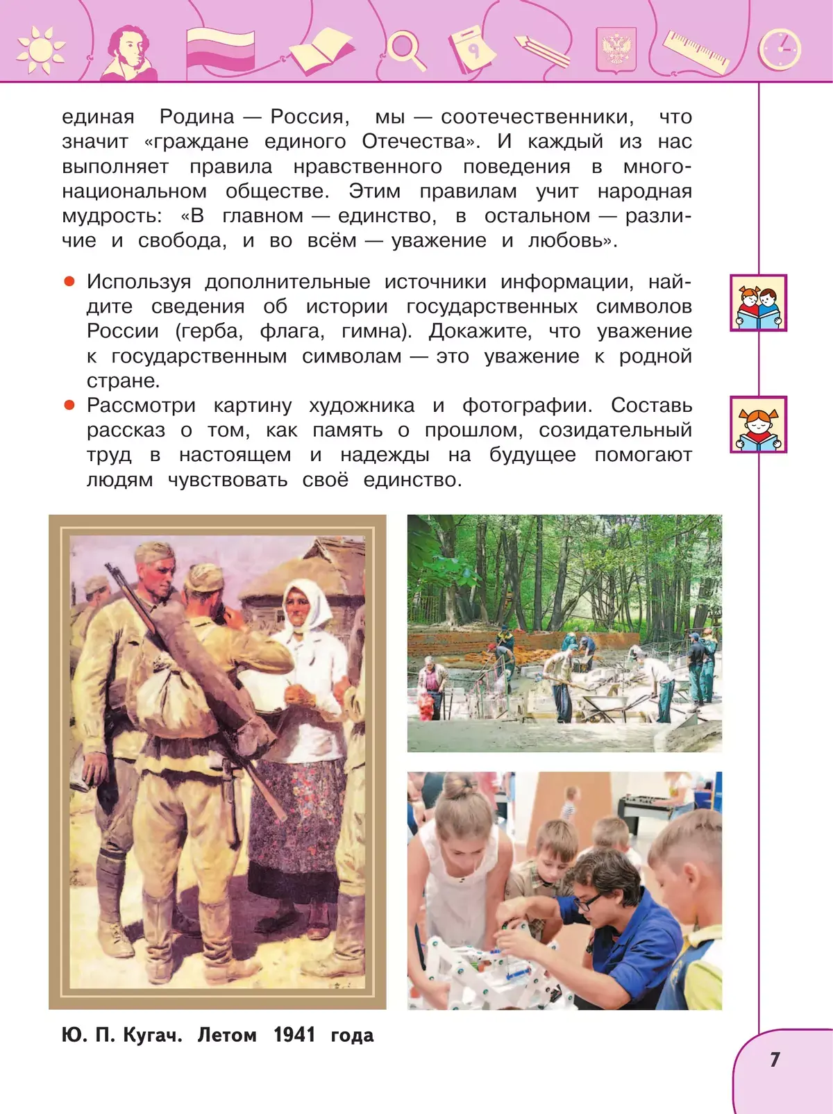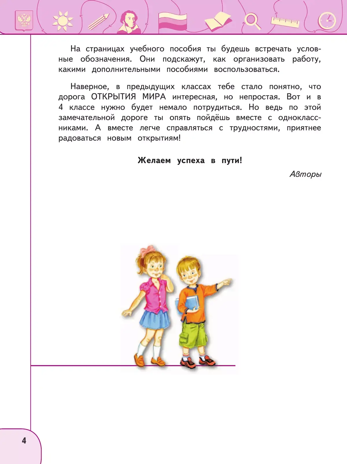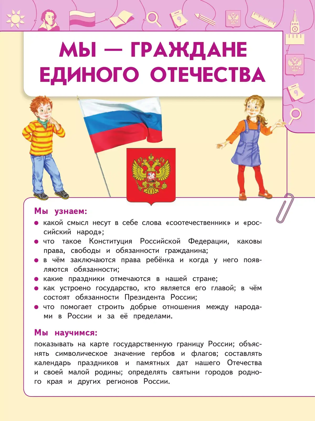 Основная цель пособия — формирование у обучающихся целостного взгляда на мир, осознания места в нём человека, освоение мирового культурного опыта, законов и правил взаимоотношений в об- ществе, развитие навыков культуры общения.