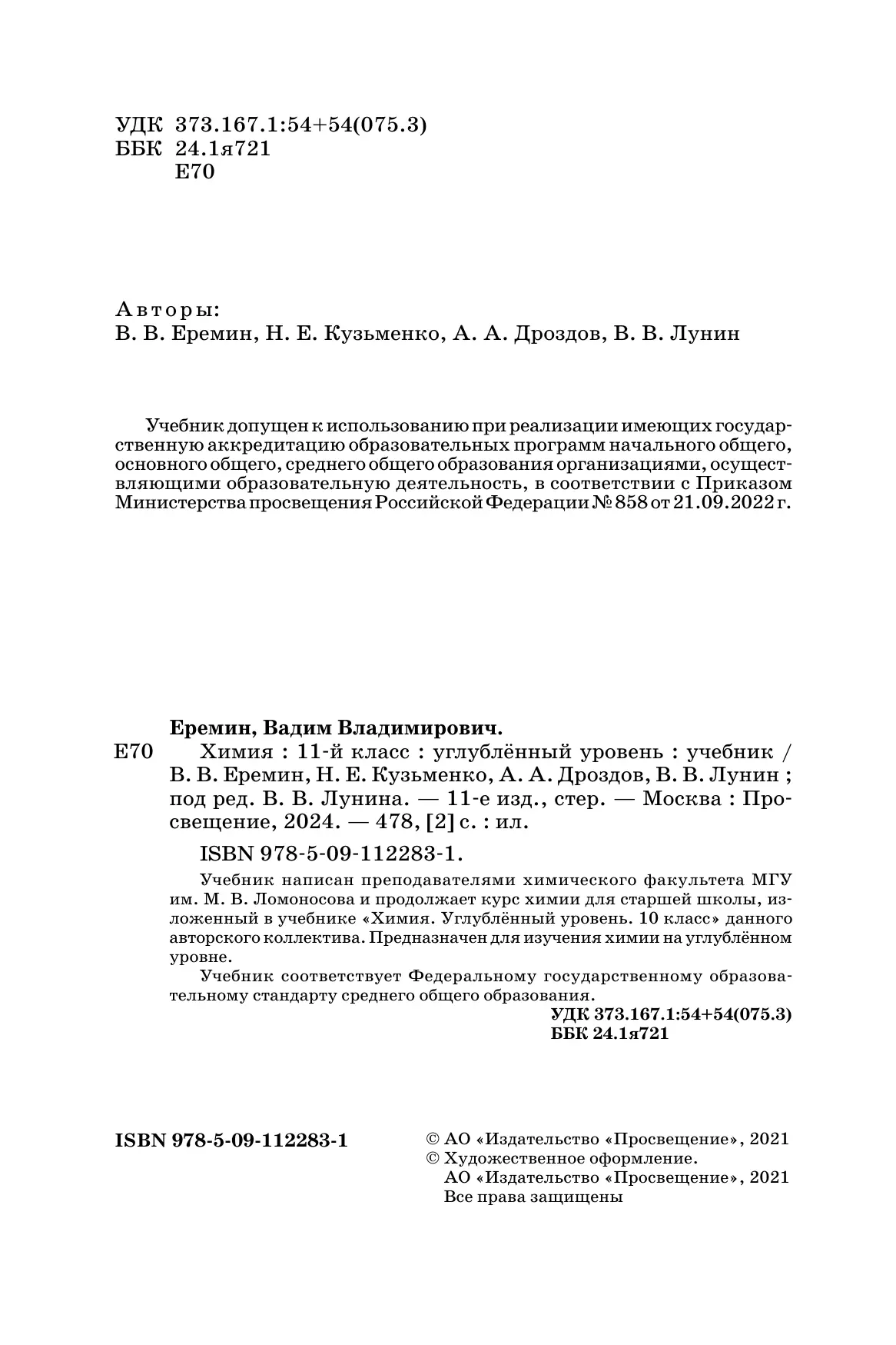Учебник соответсвует ФГОС 2021 г. Учебник написан преподавателями химического факультета МГУ им. М. В. Ломоносова и продолжает курс химии для старшей школы, изложенный в учебнике «Химия. Углублённый уровень. 10 класс» данного авторского коллектива.