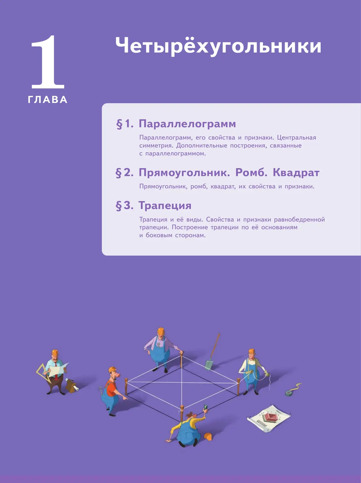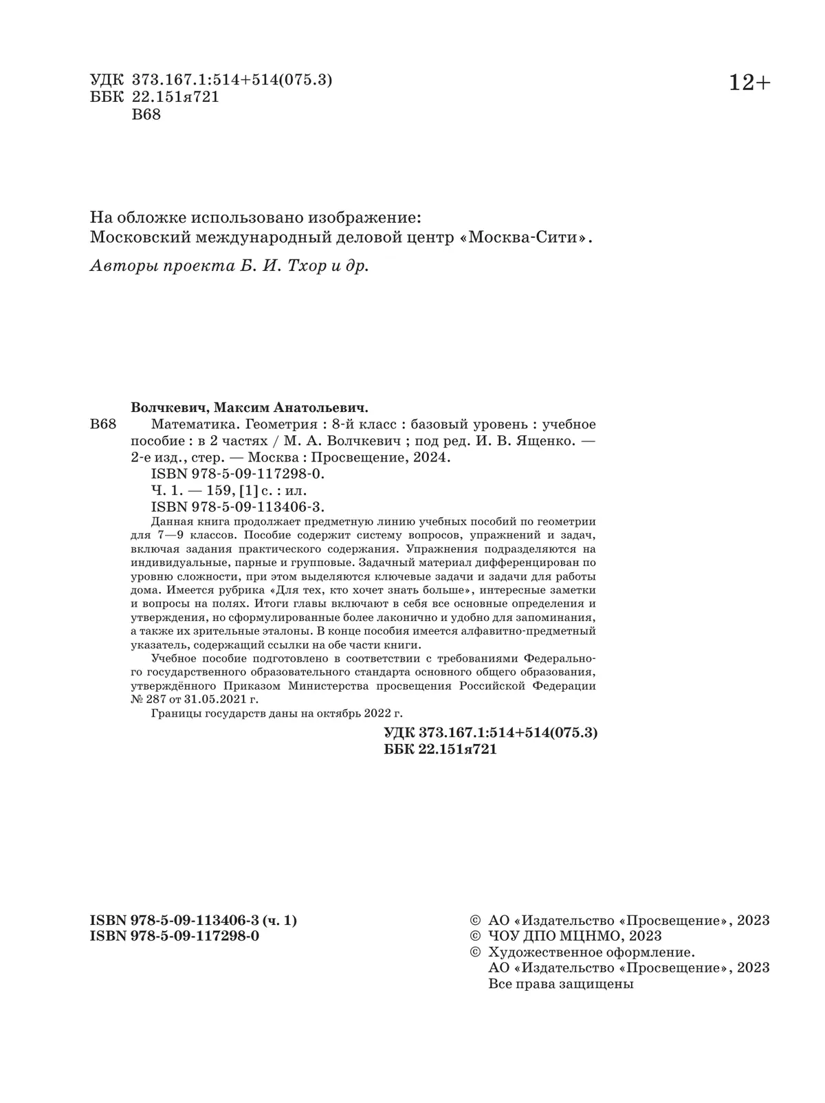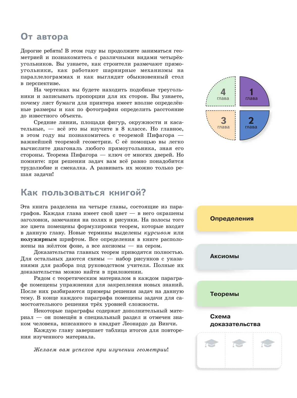 Данное учебное пособие продолжает предметную линию по геометрии для 7—9 классов. Книга имеет систему вопросов, упражнений и задач. Упражнения подразде- ляются на индивидуальные, парные и групповые, а также домашние. Задачный материал дифференцирован по уровню сложности, но отдельно выделяются клю- чевые задачи и задачи для домашнего решения. Имеется рубрика «Для тех, кто хо- чет знать больше», интересные заметки и вопросы на полях. Итоги главы включа- ют в себя все основные определения и утверждения, но сформулированные более лаконично и удобно для запоминания, а также их зрительные эталоны. В конце пособия имеется алфавитно-предметный указатель, содержащий ссылки не толь- ко на первую часть книги, но и на вторую. Для повторения курса геометрии 7 класса имеется одноимённый раздел. Учебное пособие подготовлено в соответствии с требованиями Федерального государственного образовательного стандарта основного общего образования, утверждённого Приказом Министерства просвещения № 287 от 31.05.2021 г.