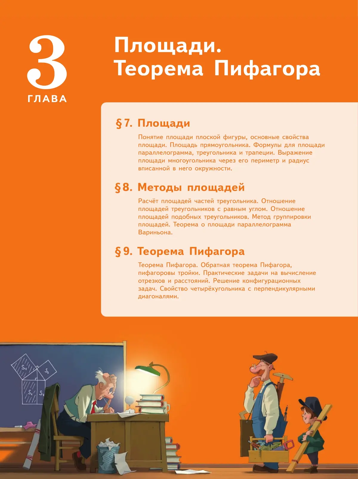 Имеется рубрика «Для тех, кто хо- чет знать больше», интересные заметки и вопросы на полях. Итоги главы включа- ют в себя все основные определения и утверждения, но сформулированные более лаконично и удобно для запоминания, а также их зрительные эталоны.