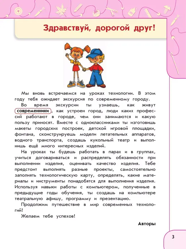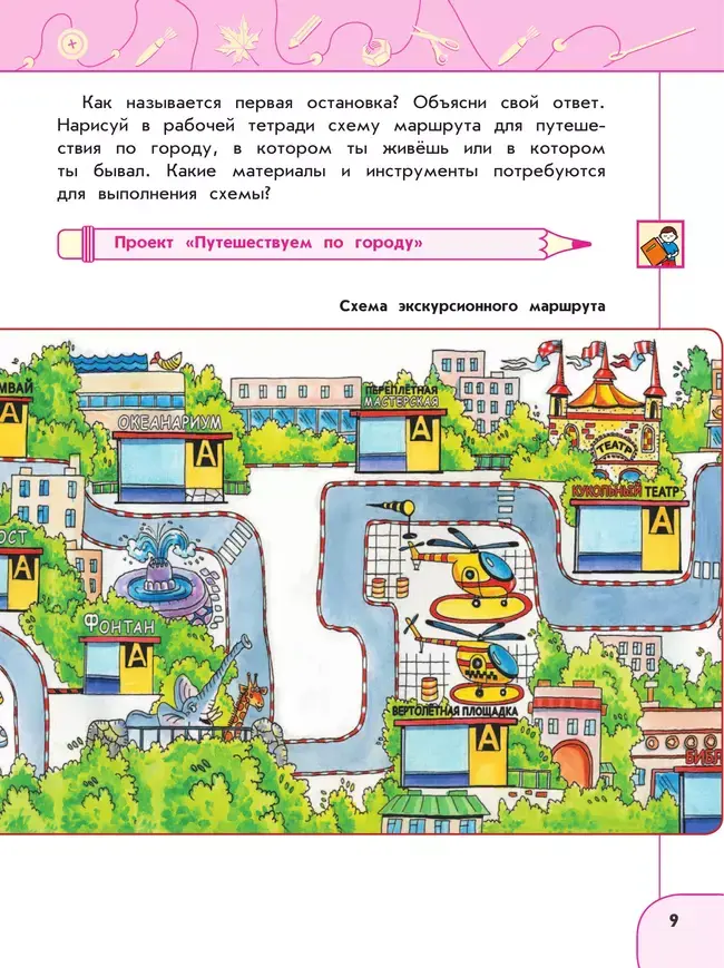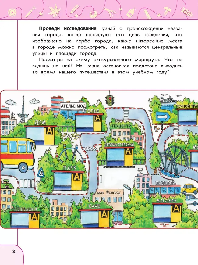 Материал учебного пособия построен в виде экскурсии по современному городу, в ходе которой школьники знакомятся с работой городских предприятий и профессиями людей.