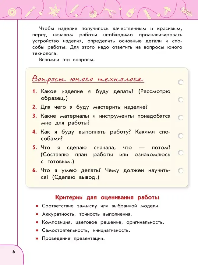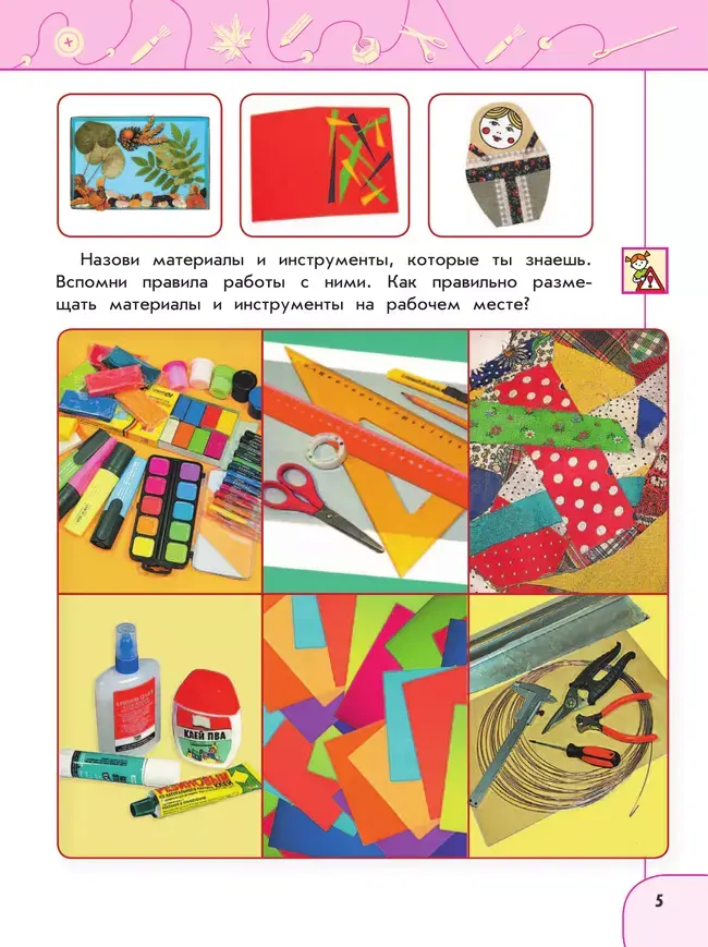 Ученики исследуют свойства материалов и используют их при выполнении изделий, учатся выполнять чертёж, осваивают и совершенствуют разнообразные техники и технологии (аппликация из бумаги, на ткани, гобелен, шитьё мягких игрушек, бисероплетение, тестопластика, оригами, конструирование и моделирование из бумаги, конструктора, природных материалов, переплётные работы).