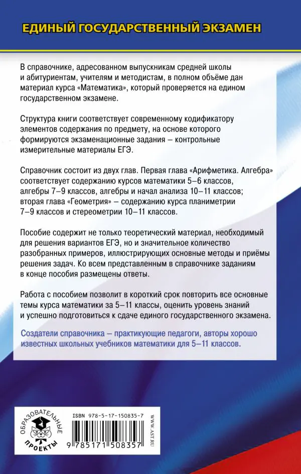 Работа с пособием позволит в короткий срок повторить все основные темы курса математики за 5–11 классы, оценить уровень знаний и успешно подготовиться к сдаче единого государственного экзамена.