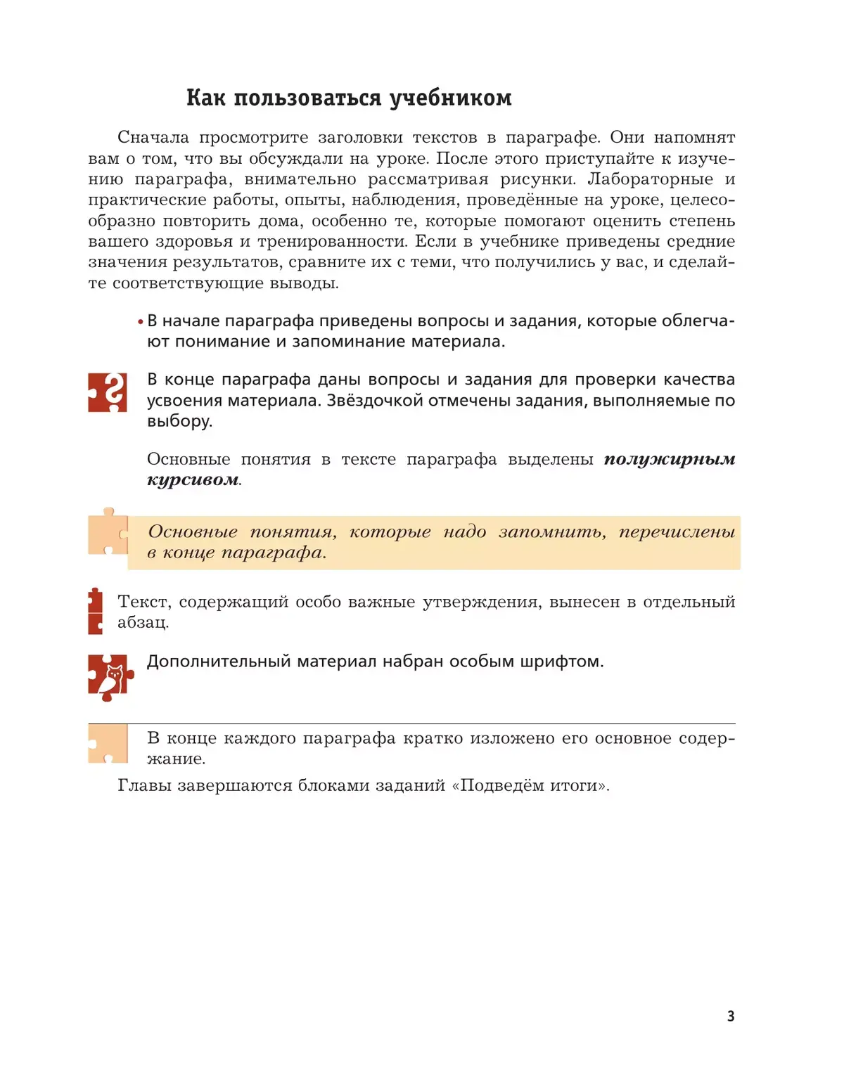 Учебник включает лабораторные и практические работы по основным темам курса. По усмотрению учителя последние параграфы тем и блоки заданий «Проверьте себя» могут быть использованы для обобщающих уроков. Звёздочкой (*) отмечены задания, выполняемые учащимися по выбору, и материал, изучаемый в обзорном порядке.