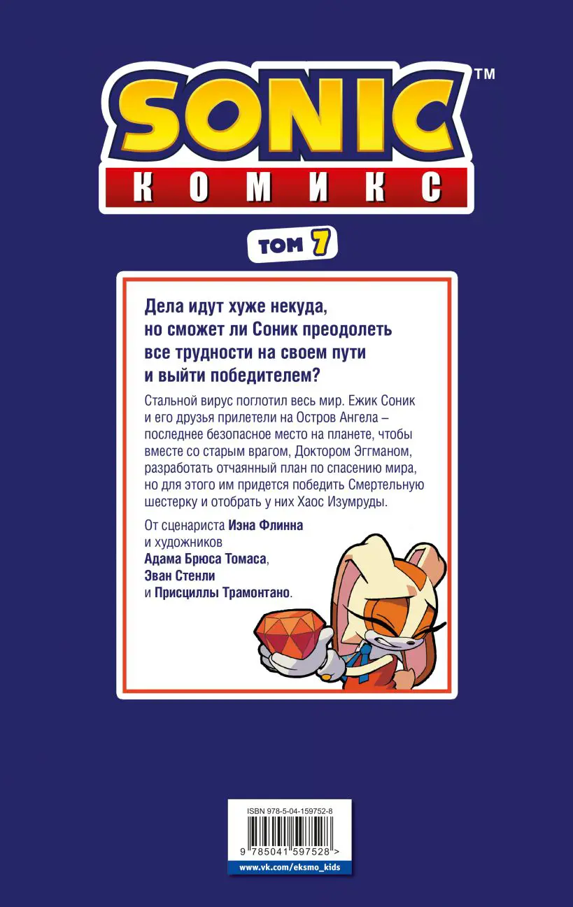 Седьмой том оригинального комикса приключений Соника и его друзей в великолепном исполнении команды Diamond Dust при участии Сыендука! Стальной вирус поглотил весь мир. Авианос захватила Смертельная шестерка. Теперь настал черед спасаться доктору Эггману и его ассистенту Старлайну с помощью телепорта в единственное безопасное место... Ежик Соник и его друзья прилетели на Остров Ангела и обнаружили там неожиданных гостей. Команде спасения придется объединиться со старым врагом, доктором Эггманом, чтобы предотвратить неминуемую катастрофу. Но как придумать план спасения и осуществить его, когда на пути стоит Смертельная шестерка, владеющая изумрудами Хаоса?