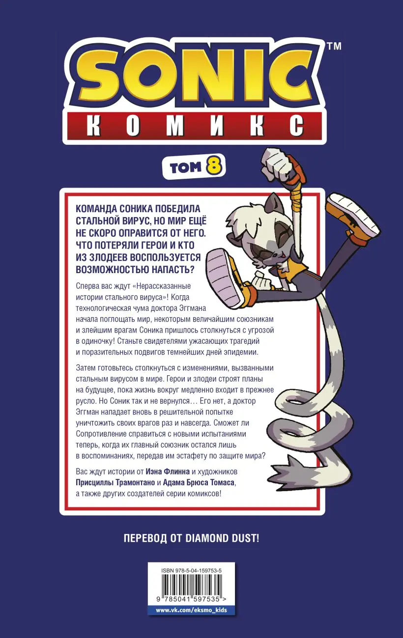 Долгожданная 8-я часть приключений Соника и его друзей после металлической эпидемии Доктора Эггмана в фанатском переводе от Diamond Dust.В сборнике "Нерассказанные истории Стального Вируса" вы узнаете:- "Биг и большая беготня". О дружбе, которой не страшны ни расстояние, ни вирус.- "Темнейший час". О преданности делу и верных напарниках.- "Отражения". О недостижимых целях.- "Выходной Эггмана". О необычных злодейских хобби.- "Держимся вместе". О силе духа и хитрости.- "Катализатор". О желании помочь, которое может обернуться катастрофой.В основном сюжете вы столкнётесь с миром, который потерял Соника! Теперь его друзьям предстоит самостоятельно справиться с разбушевавшейся Смертельной шестёркой и научиться жить без сверхзвукового ёжика.Доктор Эггман ликует - его главный враг повержен! Как же он поступит с ослабленным Сопротивлением, когда на его пути больше нет Соника?Узнайте, смогут ли справиться любимые герои с эстафетой по защите мира.
