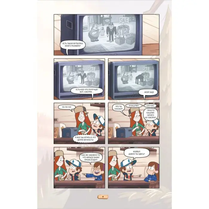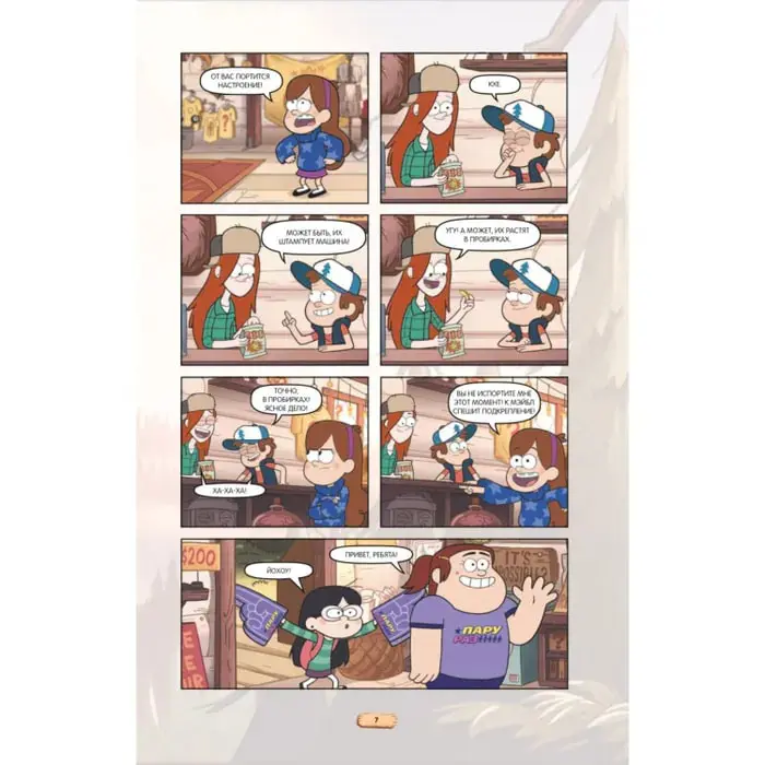 6-й выпуск графических романов «Гравити Фолз» не разочарует тех, кто зачитал до дыр предыдущие пять выпусков. Красочные иллюстрации, интересные герои и любимые сюжеты ждут фанатов на страницах книги: вы сможете заново пережить любовное безумие и вспомнить, как же выглядела Земля до начала свиней.
