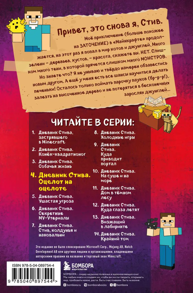 Приключения Стива продолжаются! Он попал в очередной мир в "Майнкрафте" — мир котов и джунглей! Красота, скажете вы — но нет, вокруг слишком много тени, в которой прячется слишком много монстров. Но Стив не унывает и твёрдо намерен обзавестись новым другом. А ещё у него есть все шансы научиться делать печеньки! Осталось только поймать парочку пауков (бр-р-р!), залезть на высоченное дерево и не потеряться в бесконечных зарослях джунглей… Приготовьтесь! Вас ждут тонны шуток, обалденные приключения, коты и море веселья! Внутри книги есть пространство для творчества, где читатель может рисовать и составить собственный план по спасению Стива! Для среднего школьного возраста.