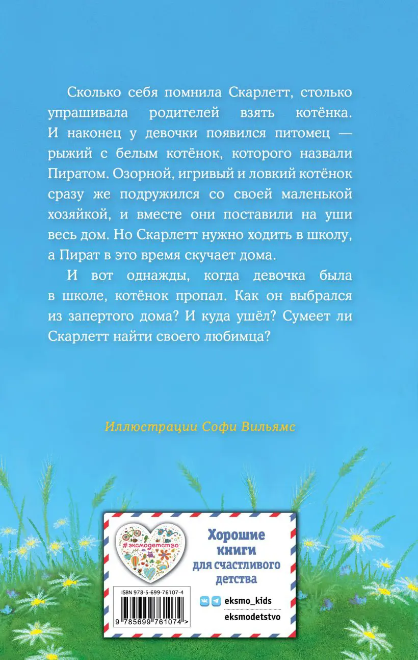 Сколько себя помнила Скарлетт, столько упрашивала родителей взять котенка. И, наконец, у девочки появился питомец - рыжий с белым котенок, которого назвали Пиратом. Озорной, игривый и ловкий котенок сразу же подружился со своей маленькой хозяйкой и вместе они поставили на уши весь дом. Но Скарлетт нужно ходить в школу, а Пират в это время скучает дома. И вот однажды, когда девочка была в школе, котенок пропал. Как он выбрался из запертого дома? И куда ушел? Сумеет ли Скарлетт найти своего любимца? Для младшего школьного возраста. Один из самых успешных проектов известного автора детских книг Холли Вебб. Каждая история учит детей быть ответственными и заботливыми по отношению к домашним питомцам. Трогательный рассказ знакомит читателя с девочкой Скарлетт и ее ловким котенком Пиратом, который однажды потерялся. Теперь малышу и девочке предстоит найти друг друга.