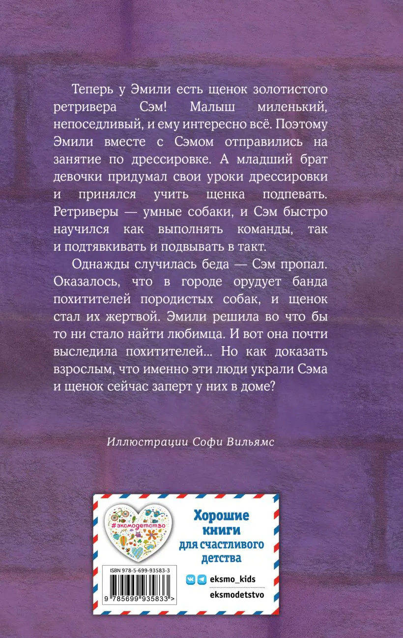 Теперь у Эмили есть щенок золотистого ретривера Сэм! Малыш миленький, непоседливый, и ему интересно все. Поэтому Эмили вместе с Сэмом отправились на занятие по дрессировке. А младший брат девочки придумал свои уроки дрессировки и принялся учить щенка подпевать. Ретриверы - умные собаки, и Сэм быстро научился как выполнять команды, так и подтявкивать и подвывать в такт. Однажды случилась беда - Сэм пропал. Оказалось, что в городе орудует банда похитителей породистых собак и щенок стал их жертвой. Эмили решила во что бы то ни стало найти любимца. И вот она почти выследила похитителей... Но как доказать взрослым, что именно эти люди украли Сэма и щенок сейчас заперт у них в доме? Для среднего школьного возраста.