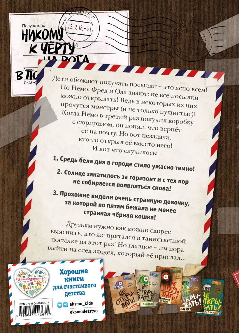 Кто не любит получать посылки? Эта книга-«посылка» запомнится надолго, ведь из неё выпрыгнет... монстр! Будьте осторожны с распаковкой! Головокружительные приключения, отличный юмор и трогательный рассказ о дружбе — здесь есть всё, что нужно хорошей детской книге! А ироничные чёрно-белые иллюстрации Фредерика Бертрана сделают её ещё интереснее!