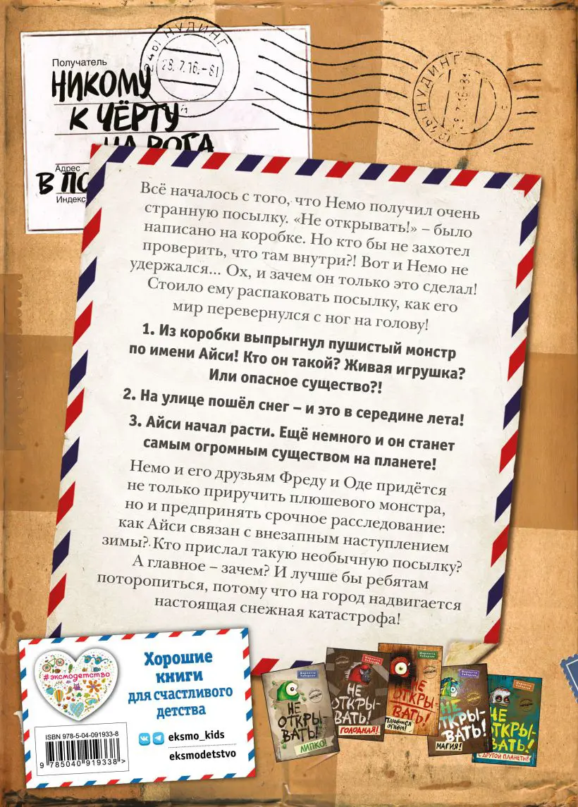 Кто не любит получать посылки? Эта книга-«посылка» запомнится надолго, ведь из нее выпрыгнет... монстр! Будьте осторожны! У книги очень необычное оформление: в обложке есть дырка! Не удивляйтесь — она очень нужна пушистому Айси, живой плюшевой игрушке.