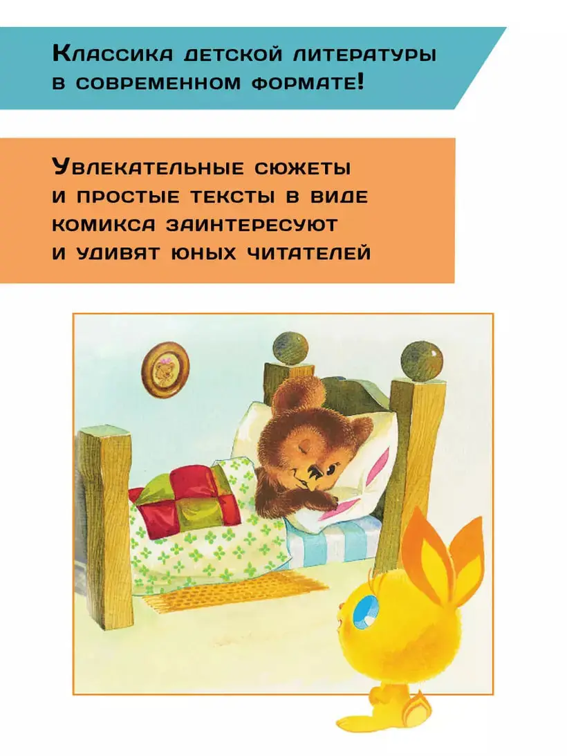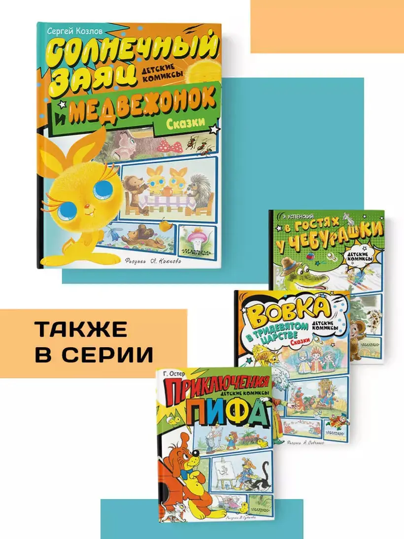 В серии "Детские комиксы" любимые сказки — в новой интерпретации! В книгу вошли трогательные истории Сергея Козлова про Ёжика, Медвежонка и их друзей. Мудрый Ёжик и добрый Медвежонок почистят зубки и сделают утреннюю зарядку с Солнечным Зайцем, а затем отправятся на прогулку в лес, где познакомятся с разными цветами и грибами и узнают, для чего какая травка в лесу нужна. Всего в сборнике четыре сказки — "Солнечный Заяц и Медвежонок", "Сыроежка", "Чёрный омут", "Волшебная травка Зверобой".