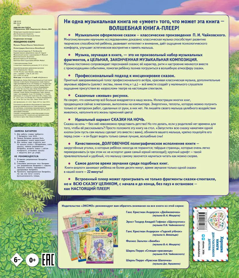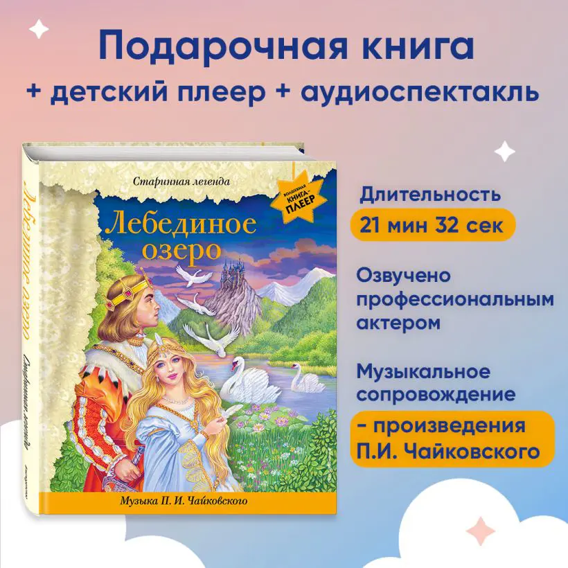 Великая старинная легенда «Лебединое озеро» в уникальном издании: подарочная книга + детский плеер + музыкальный аудиоспектакль с шедеврами Чайковского и мировой классики! Время звучания сказки – 21 минута 32 секунды. Батарейки идут в комплекте! Невероятно трогательная сказка о прекрасной принцессе, которую злой волшебник превратил в лебедя в сопровождении легендарных композиций П.И. Чайковского. Музыкальная книга с плеером - отличный подарок для современного ребенка. Красочное иллюстрированное издание классической сказки дополнено звуковым модулем-плеером с 10 кнопками. Нажимая на яркие, крупные кнопки на панели модуля, можно прослушать сказку как по страницам, так и полностью, от начала до конца, а также сделать паузу в прослушивании. Профессиональное художественное чтение текста сопровождается музыкальными композициями – шедеврами мировой классики Чайковского - и дополнительными звуками (шелест листвы, пение птиц и т. п.), создающими эффект присутствия на настоящем спектакле! В книге крупный шрифт и большие буквы, чтобы ребенок мог читать самостоятельно или вместе со взрослыми. Также она сделана из плотного картона с закруглёнными уголками, поэтому мамы могут не опасаться, что ребёнок поранится или порвёт странички. Музыкальная книжка будет интересным и полезным подарком для ребенка. Погрузитесь в волшебную атмосферу любимых классических детских сказок!