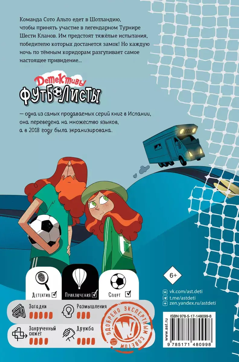 Команда Сото Альто едет в Шотландию, чтобы принять участие в легендарном Турнире Шести Кланов. Им предстоят тяжёлые испытания, победителю которых достанется замок! Но каждую ночь по тёмным коридорам разгуливает самое настоящее привидение...Роберто Сантьяго работал сценаристом на телевидении, редактором и продюсером.Серия про детективов-футболистов стала настоящим культурным феноменом, это одни из самых продаваемых книг в Испании, они переведены на разные языки мира, а в 2018 году даже были экранизированы.