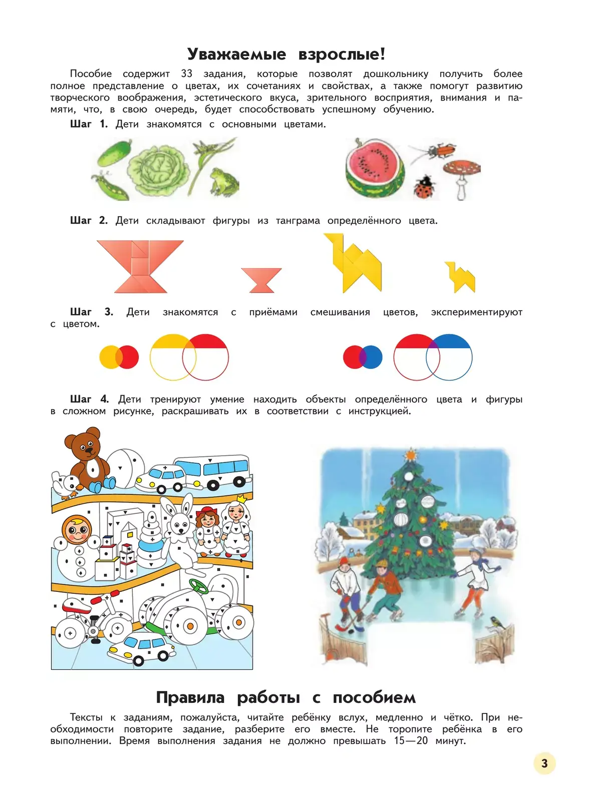 Пособие "Цветной мир" для детей 5-6 лет входит в УМК "Ступеньки к школе", в котором представлена уникальная система развития школьно-значимых функций и подготовки детей к школе. Задания пособия позволят дошкольнику получить более полное представление о цветах и их сочетаниях, познакомят с приемами смешивания цветов, а также потренируют в нахождении геометрических фигур в сложном рисунке. Соответствует федеральному государственному образовательному стандарту дошкольного образования.