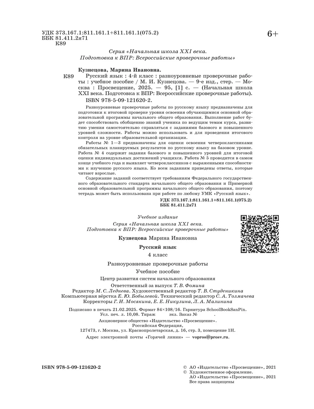 Разноуровневые проверочные работы по русскому языку предназначены для подготовки к итоговой проверке уровня освоения обучающимися основной образовательной программы начального общего образования. Выполнение работ будет способствовать обобщению знаний ученика по ведущим темам курса, развитию умения самостоятельно справляться с заданиями базового и повышенного уровней сложности. Работы можно использовать и для проведения итогового контроля на уровне образовательной организации.