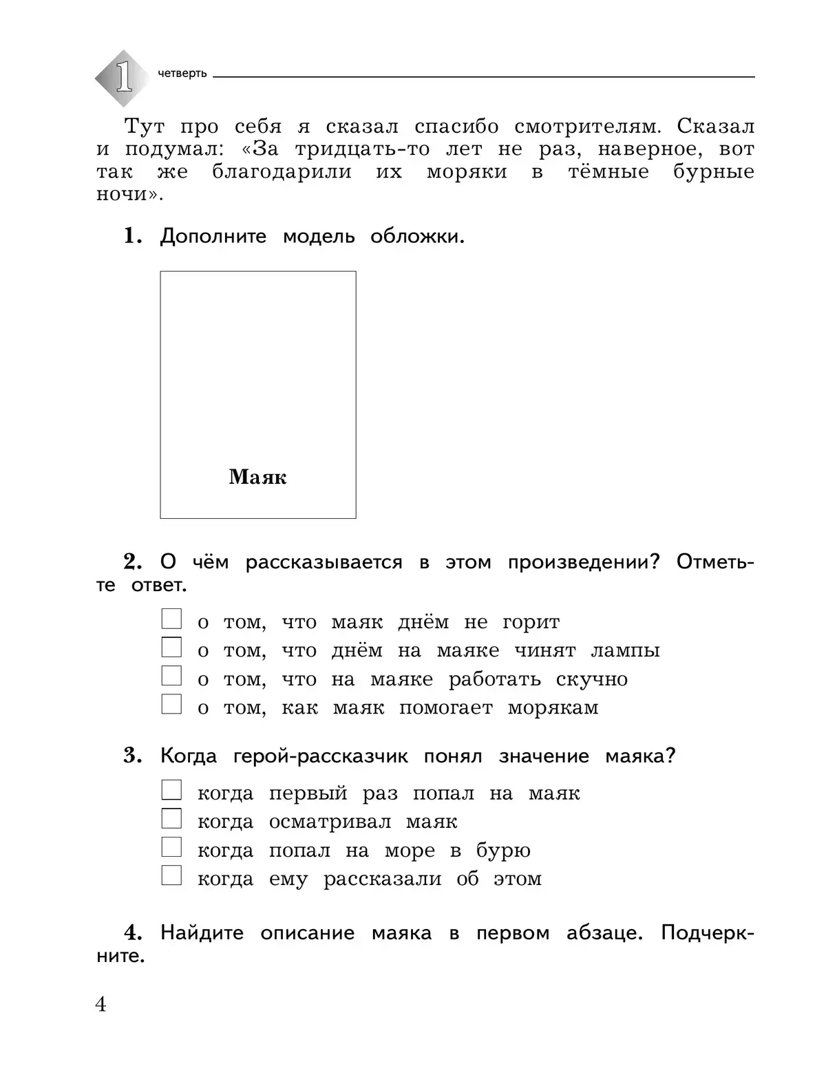 В тетради предлагаются текущие и итоговые комплексные контрольные работы для первого полугодия, которые состоят из двух блоков: «Умение читать, понимать прочитанное и работать с произведением» и «Начитанность и читательская компетентность», а также тестовые задания по изученным разделам и материал для самопроверки умения читать. Тетради для контрольных работ включены в учебно-методический комплект по литературному чтению (авт. Л. А. Ефросинина, М. И. Оморокова), входящий в систему «Начальная школа XXI века». Соответствует Федеральному государственному образовательному стандарту начального общего образования.