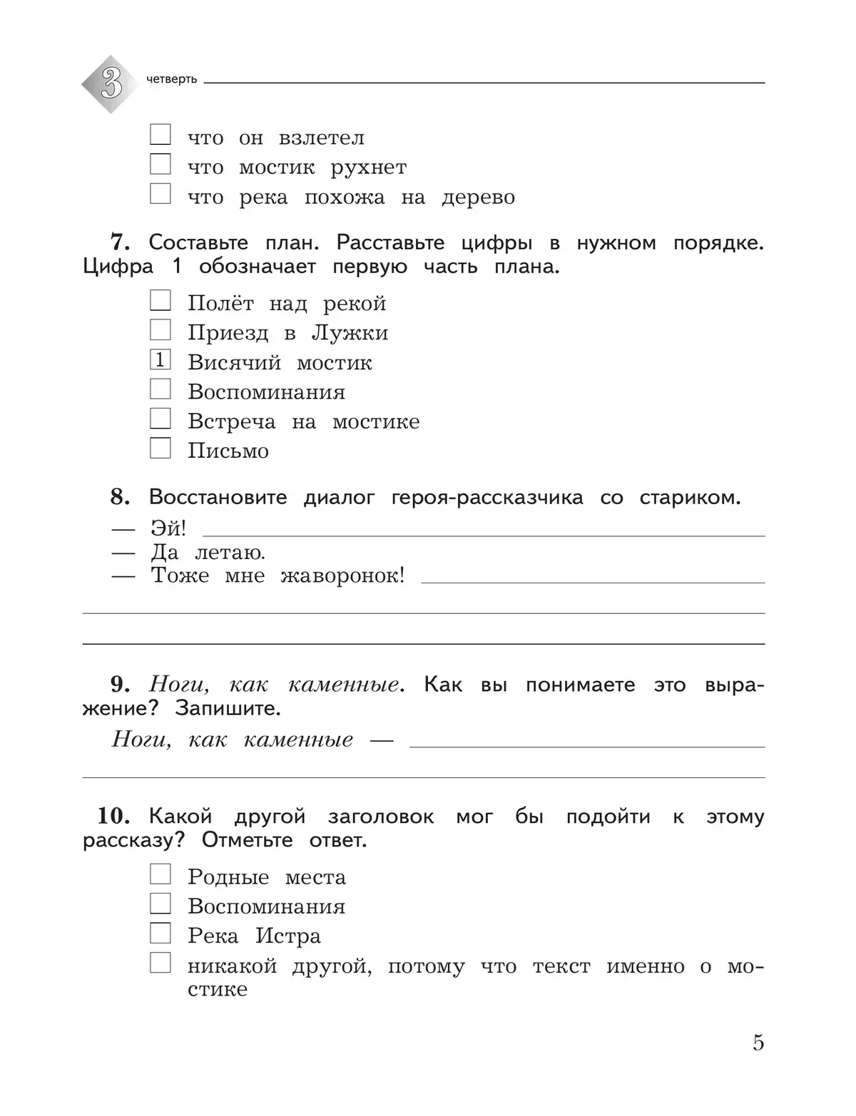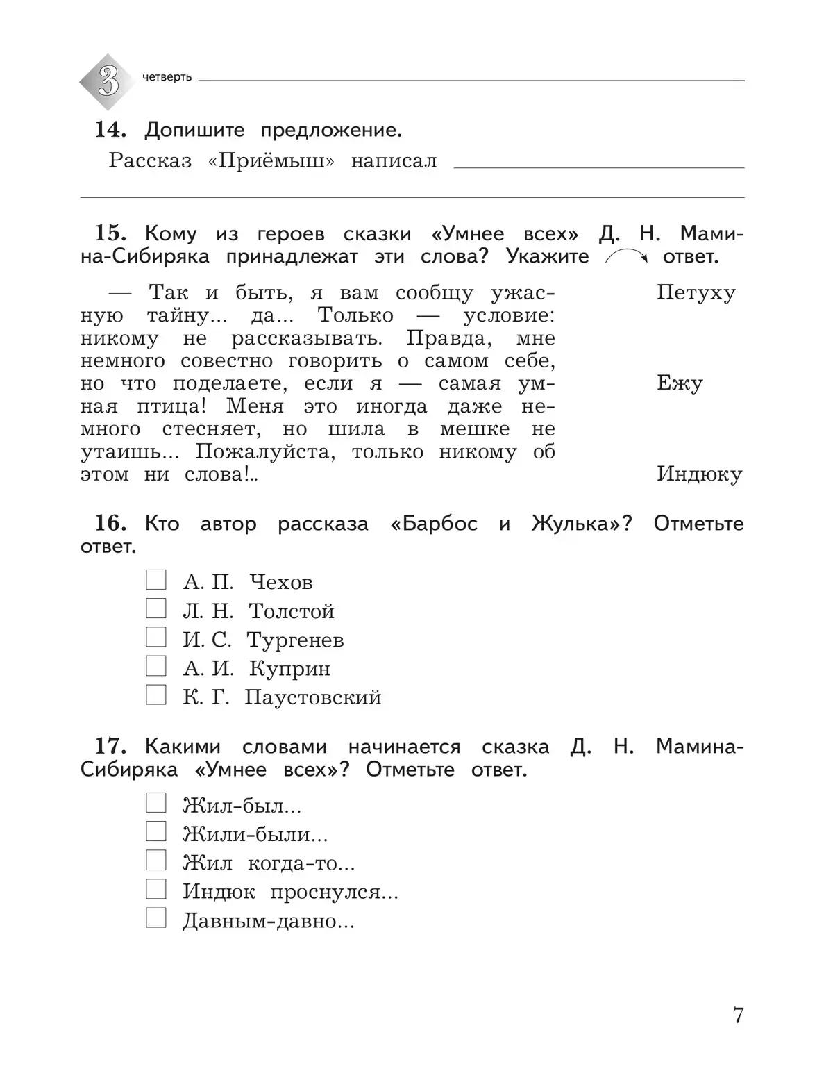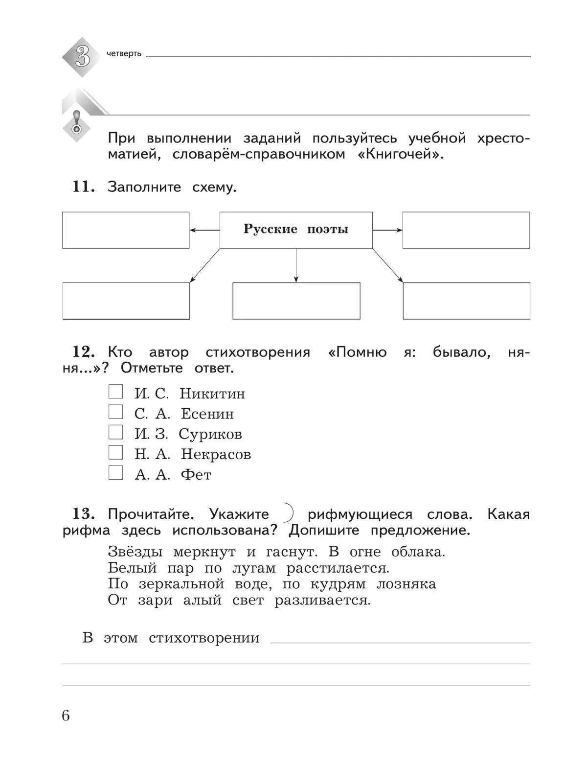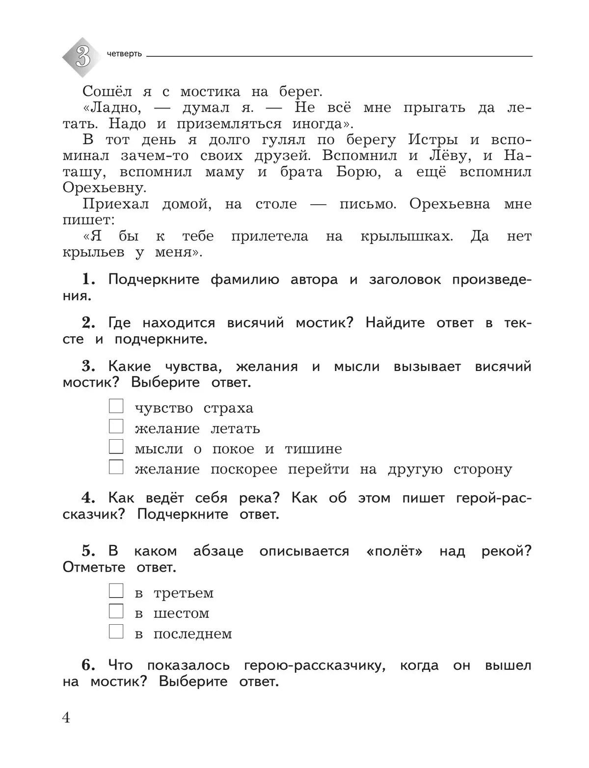 В тетради предлагаются текущие и итоговые комплексные контрольные работы для первого полугодия, которые состоят из двух блоков: «Умение читать, понимать прочитанное и работать с произведением» и «Начитанность и читательская компетентность», а также тестовые задания по изученным разделам и материал для самопроверки умения читать. Тетради для контрольных работ включены в учебно-методический комплект по литературному чтению (авт. Л. А. Ефросинина, М. И. Оморокова), входящий в систему «Начальная школа XXI века». Соответствует Федеральному государственному образовательному стандарту начального общего образования.