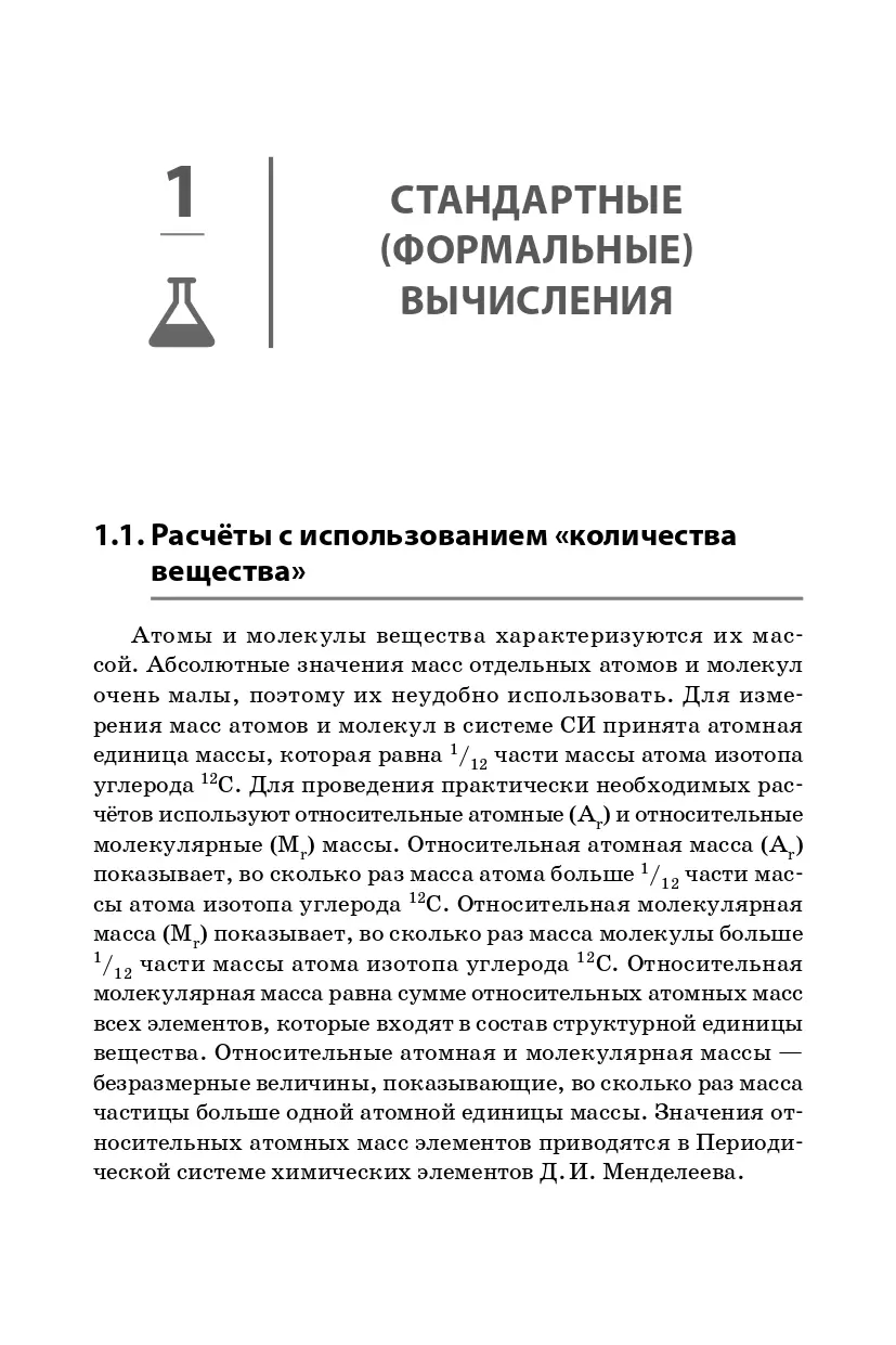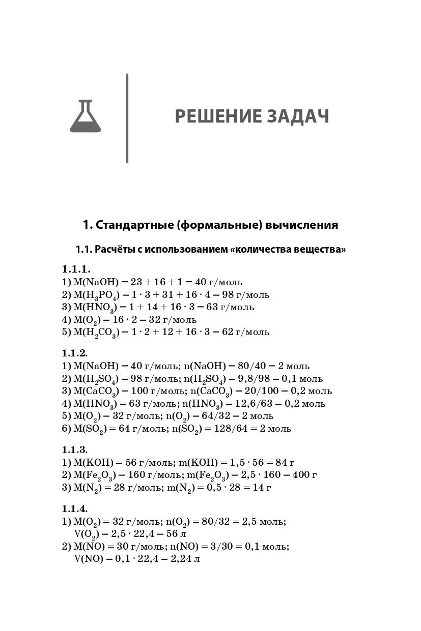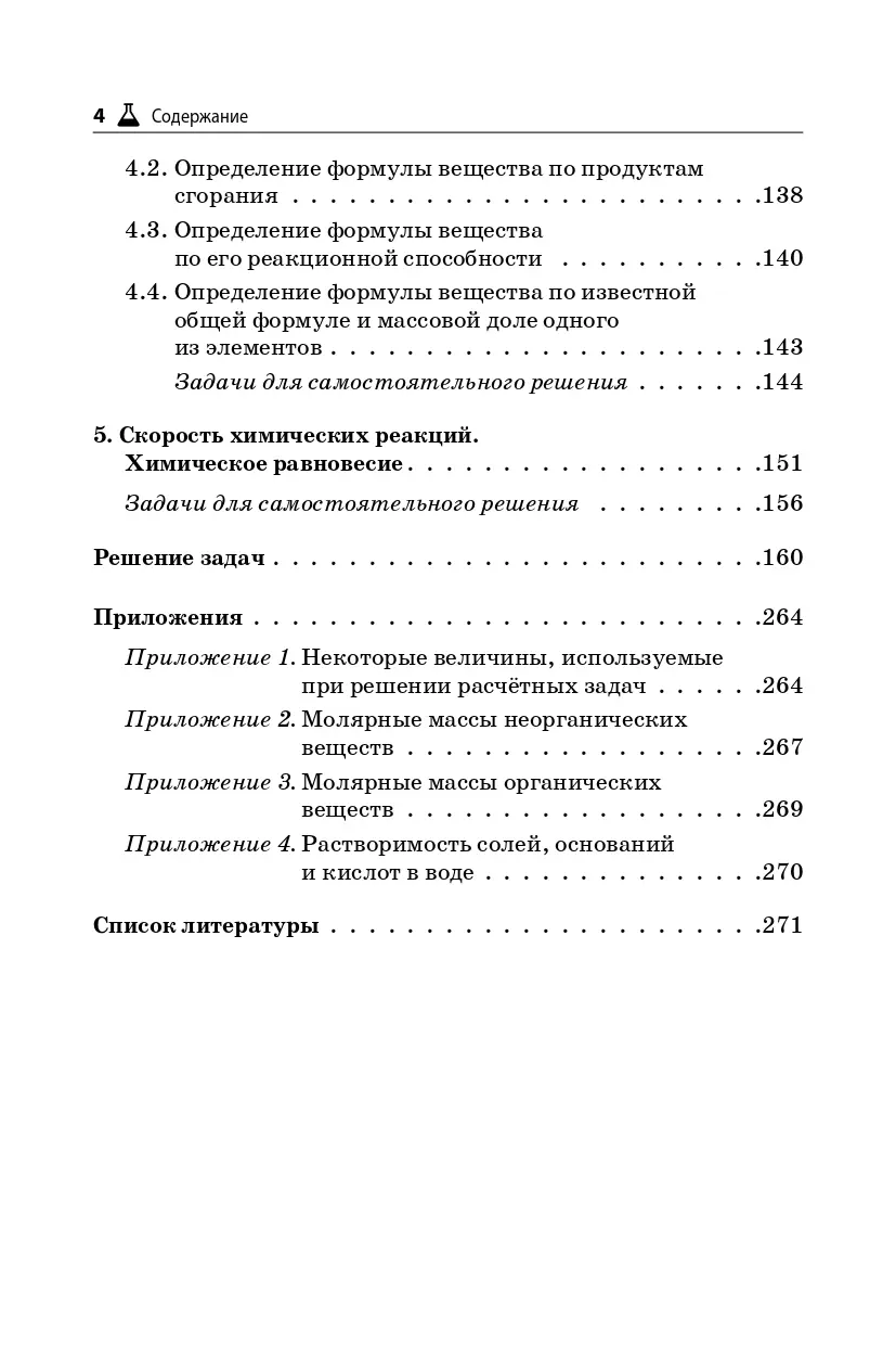 Книга содержит пять глав: стандартные (формальные) вычисления; типовые расчёты по уравнениям реакций; комплексные задачи; задачи по определению формул веществ; скорость химических реакций, химическое равновесие. Всего в пособии более 370 задач с ответами и решениями и 70 примеров выполнения заданий. В книге представлены задачи широкого спектра и различных уровней сложности, что позволит обучающимся быть готовыми к любым изменениям в формате и содержании задач.