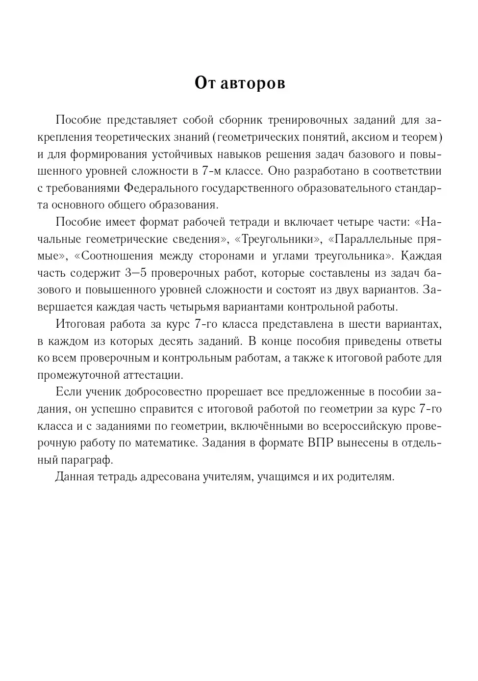 Наше пособие — сборник тренировочных заданий базового и повышенного уровней сложности для семиклассников. Оно позволит учащимся поэтапно и заблаговременно отработать учебный материал по геометрии, необходимый для подготовки к ВПР и ОГЭ. Тетрадь разработана в соответствии с требованиями ФГОС основного общего образования и подходит для работы с любым УМК.