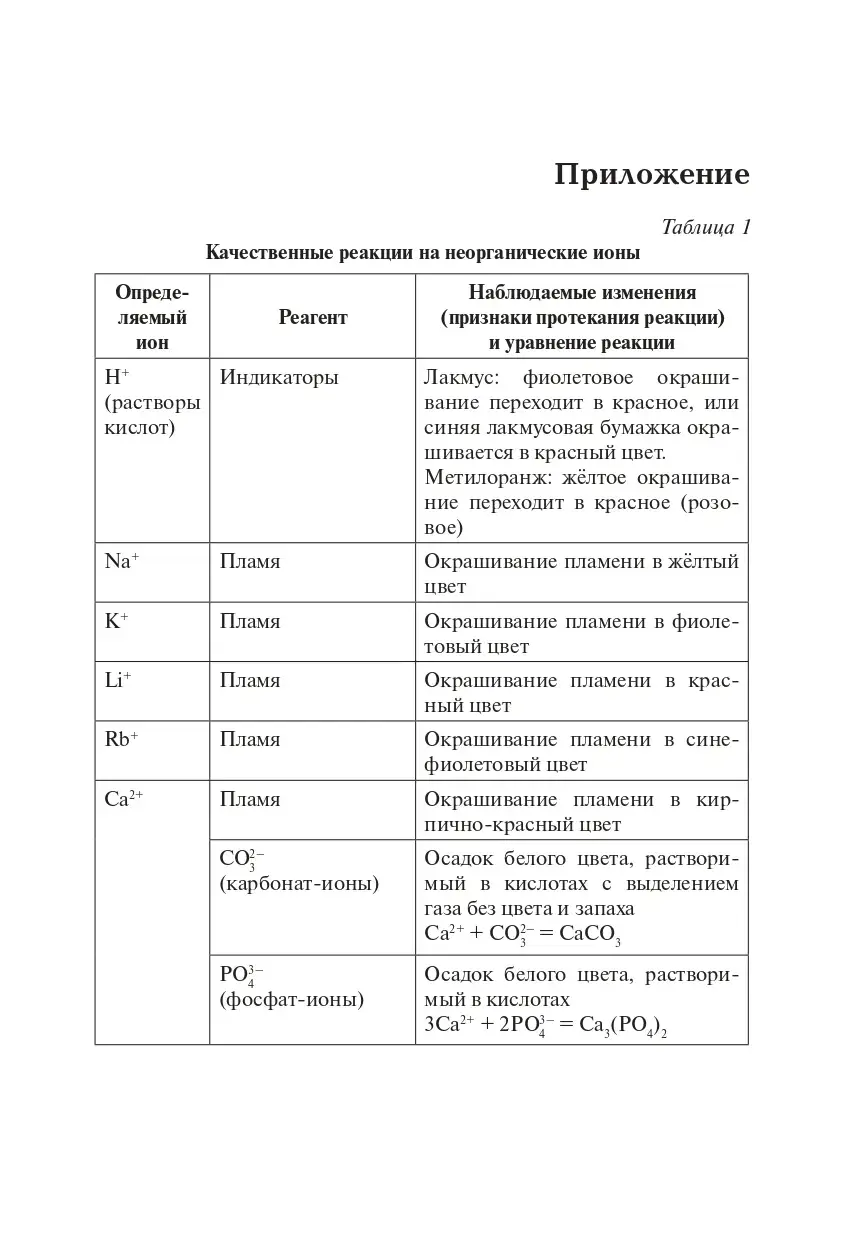 Завершает пособие приложение, в котором даются сведения о качественных реакциях неорганических и органических веществ, признаках химических превращений и тривиальных названиях веществ.