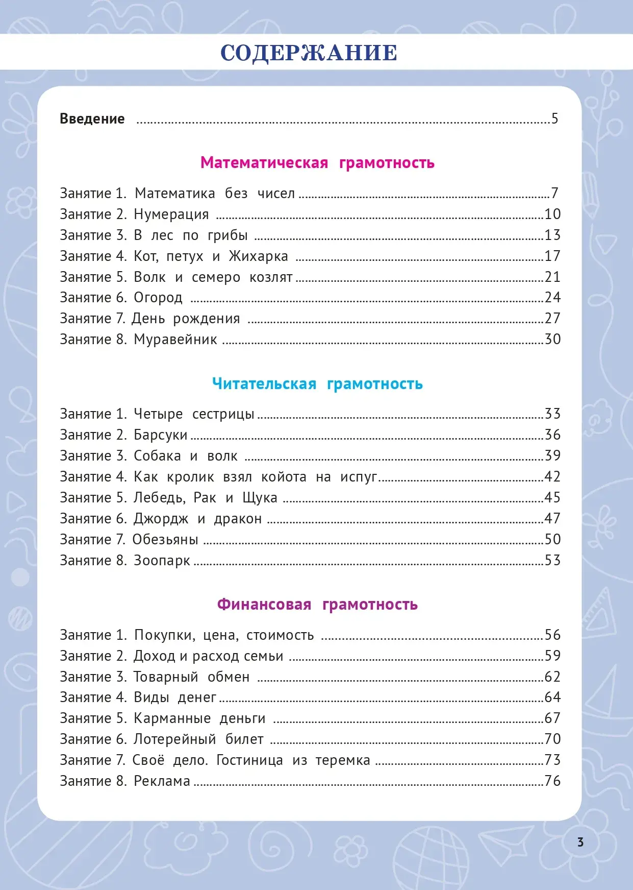 Занятия курса представлены в четырёх разделах: «Математическая грамотность», «Читательская грамотность», «Естественно-научная грамотность» и «Финансовая грамотность».