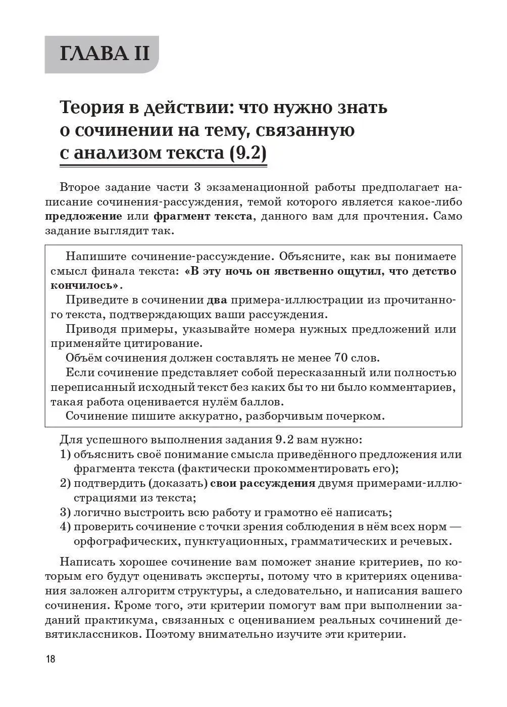 Автор приводит теоретические сведения о тексте, о структуре и компонентах сочинения, алгоритмы работы с различными текстами, а также систему практических заданий по написанию сочинения 9.2.
