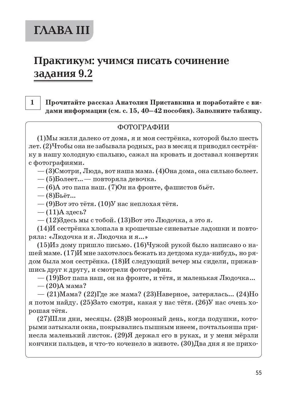 Большое количество схем и таблиц поможет оптимальному восприятию и запоминанию материала, а оригинальные задания, в том числе и проверка реальных сочинений, в кратчайшие сроки научит девятиклассников писать сочинения.