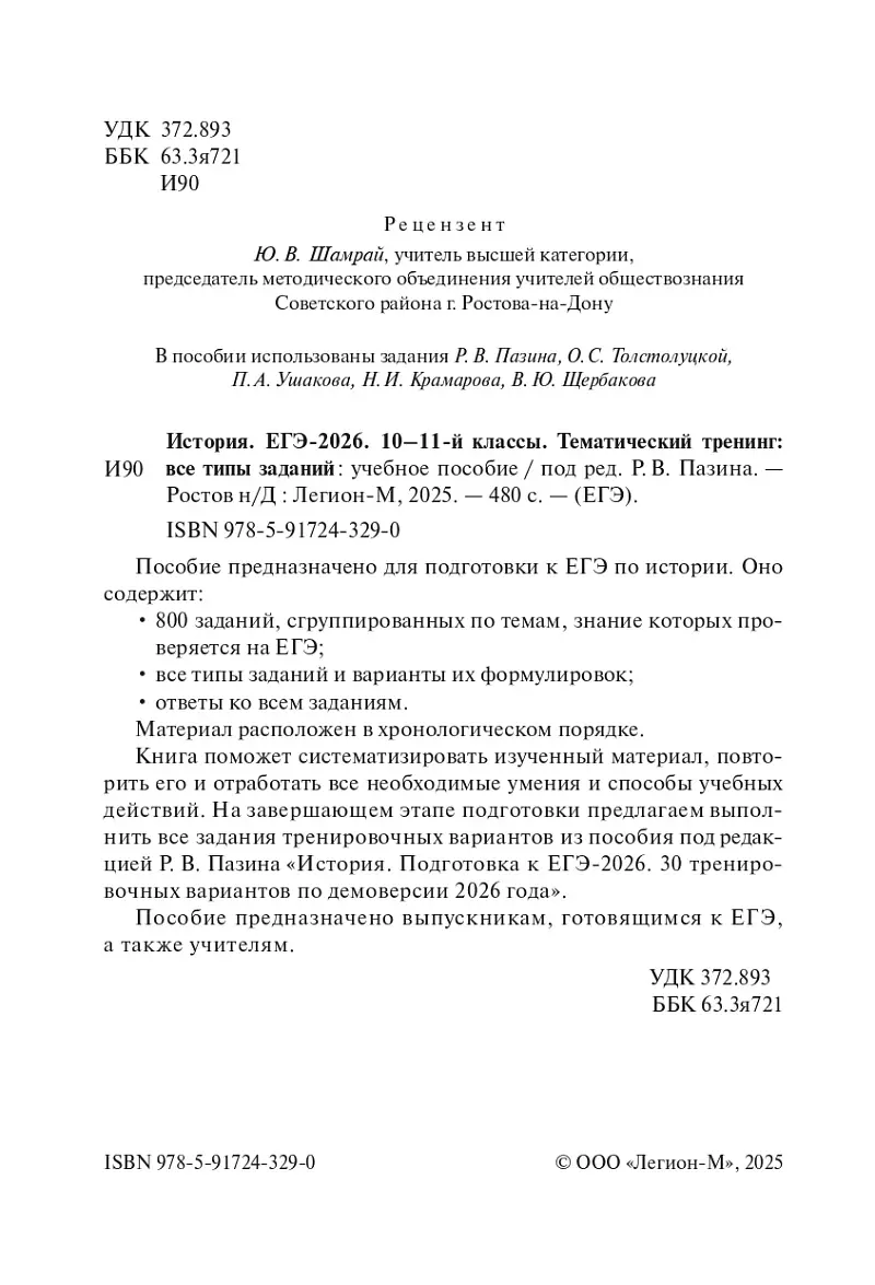 Книга поможет систематизировать изученный материал, повторить его и отработать все необходимые умения и способы учебных действий. На завершающем этапе подготовки предлагаем выполнить все задания тренировочных вариантов из пособия под редакцией Р. В. Пазина «История. Подготовка к ЕГЭ-2026. 30 тренировочных вариантов по демоверсии 2026 года».