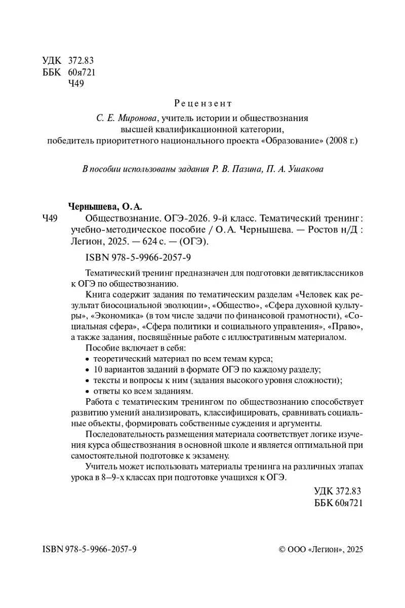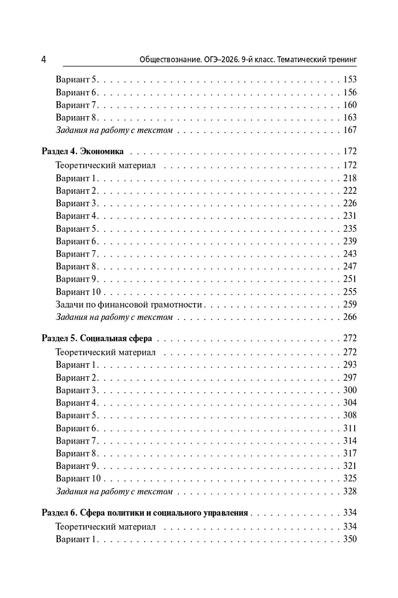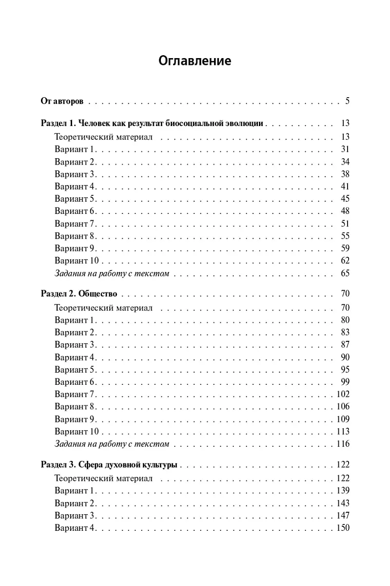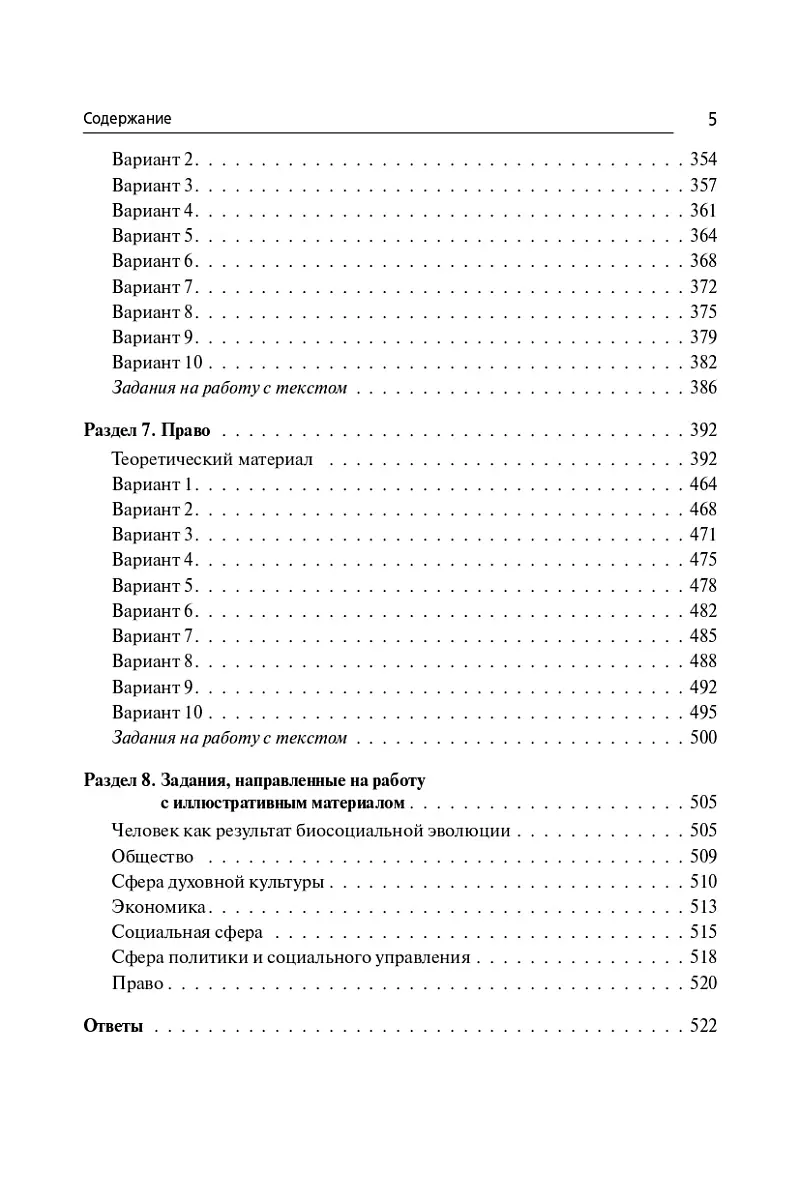 Книга содержит задания по тематическим разделам «Человек как результат биосоциальной эволюции», «Общество», «Сфера духовной культуры», «Экономика» (в том числе задачи по финансовой грамотности), «Социальная сфера», «Сфера политики и социального управления», «Право», а также задания, посвящённые работе с иллюстративным материалом.
