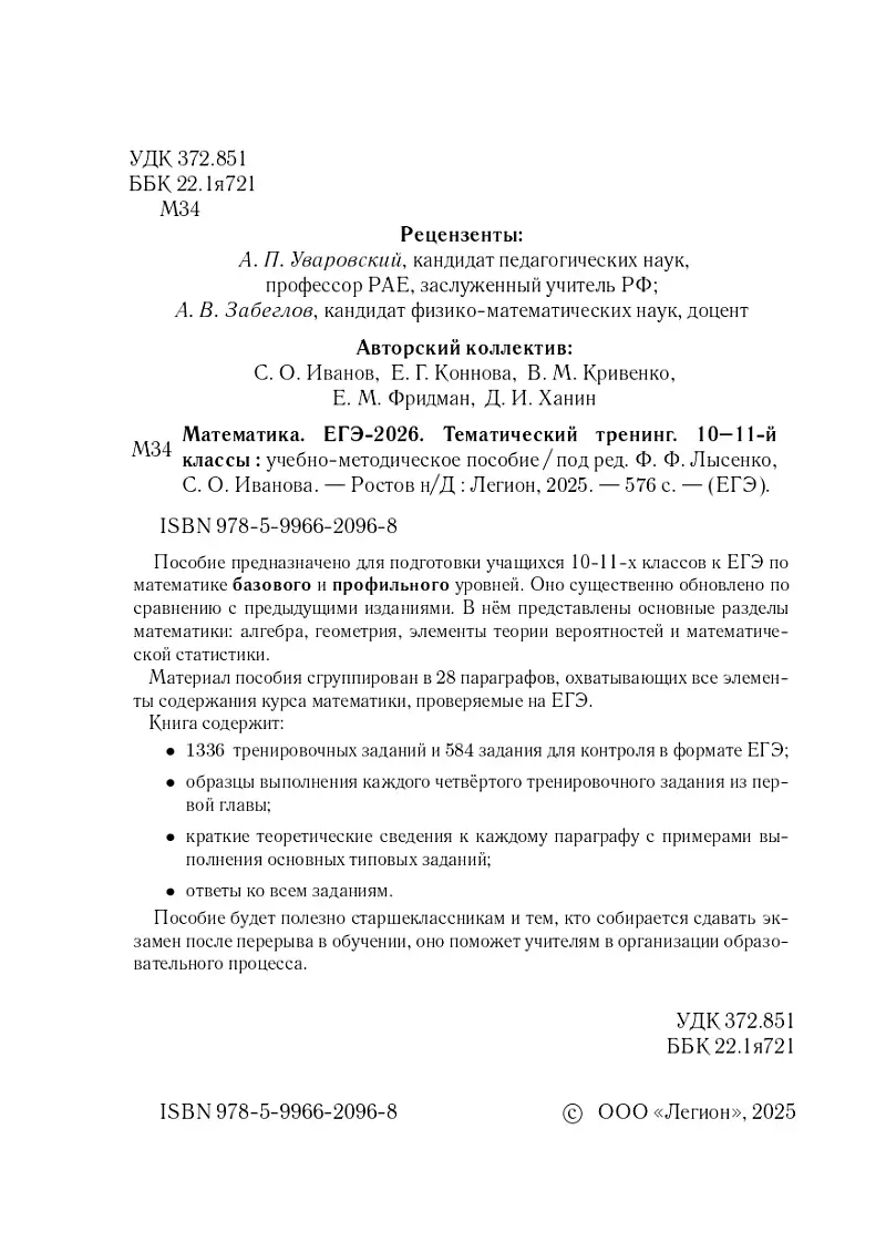 Пособие предназначено для подготовки учащихся 10-11-х классов к ЕГЭ по математике базового и профильного уровней. Оно существенно обновлено по сравнению с предыдущими изданиями. В нём представлены основные разделы математики: алгебра, геометрия, элементы теории вероятностей и математической статистики.