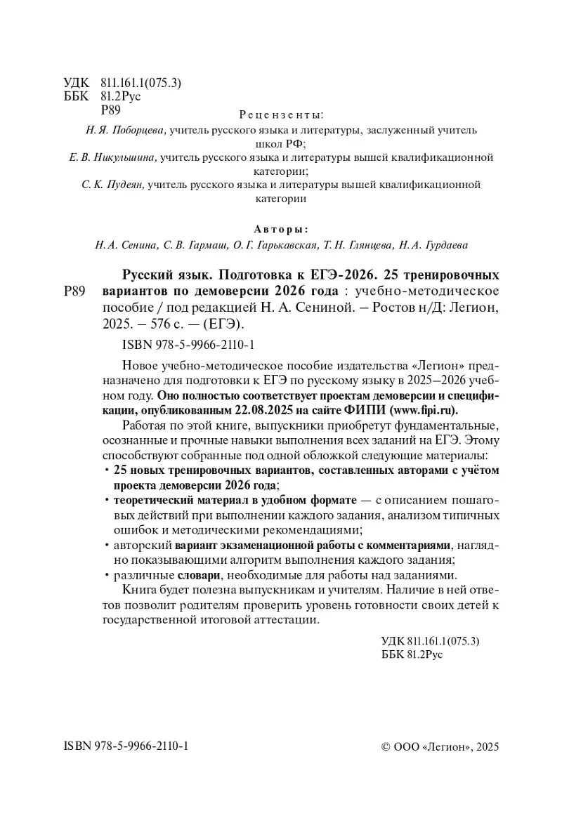 Новое учебно-методическое пособие издательства «Легион» предназначено для подготовки к ЕГЭ по русскому языку в 2025–2026 учебном году. Оно полностью соответствует проектам демоверсии и спецификации, опубликованным 22.08.2025 на сайте ФИПИ (www.fi pi.ru).