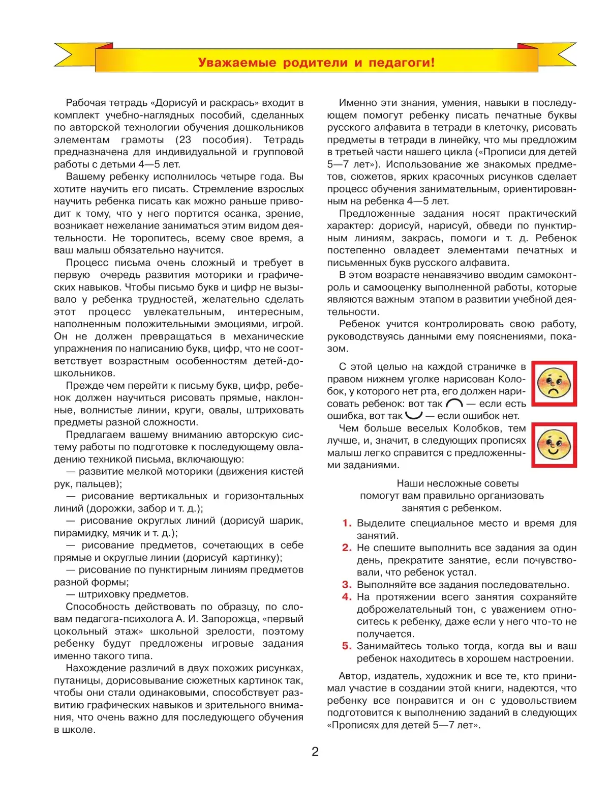 Рабочая тетрадь «Дорисуй и раскрась» входит в комплект учебно-наглядных пособий, разработанных в русле авторской педагогической технологии по обучению дошкольников элементам грамоты.