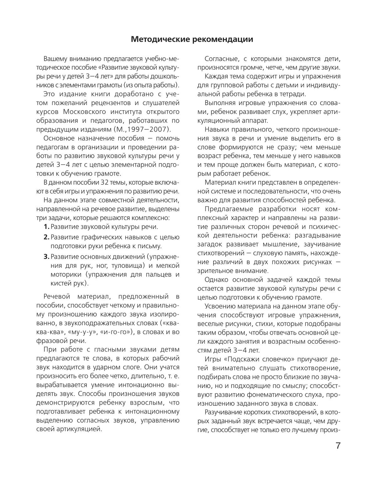 Книга является 1-й частью авторской программы "От звука к букве" по подготовке детей 3-7 лет к обучению грамоте (2-я часть - "Развитие фонематического слуха у детей 4-5 лет"; 3-я часть - "Развитие звуко-буквенного анализа у детей 5-6 лет"; 4-я часть - "Развитие интереса и способностей к чтению у детей 6-7 лет").