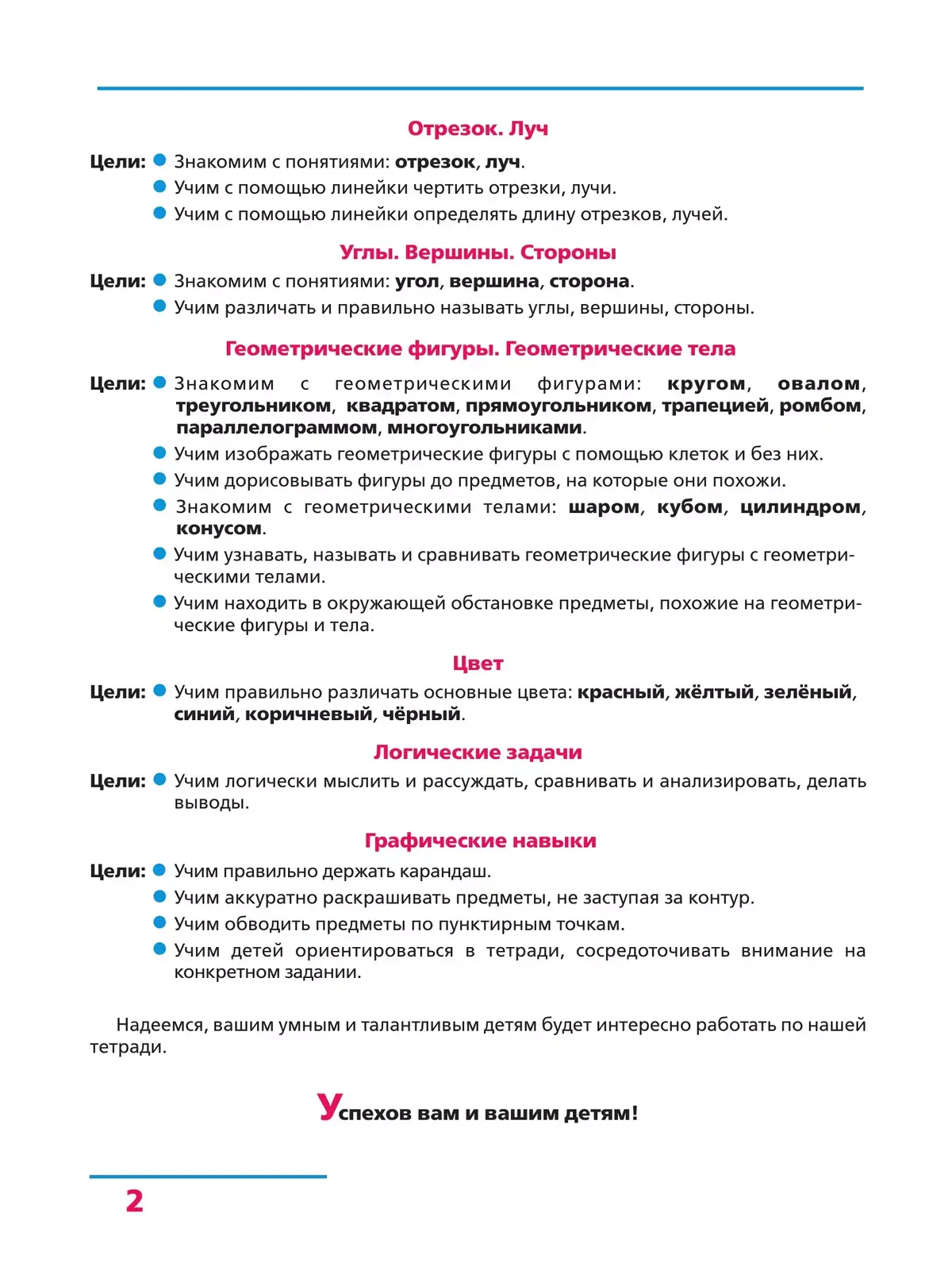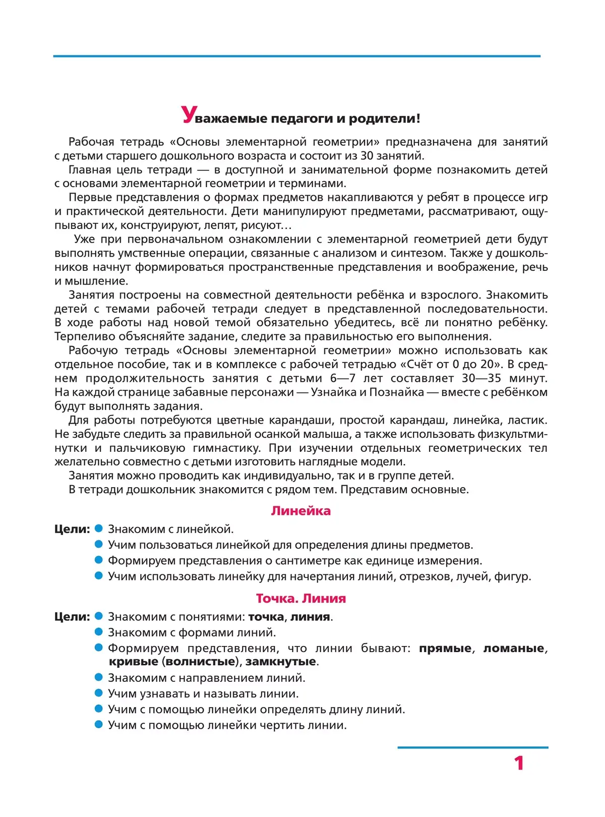 Цель пособия — в доступной и занимательной форме познакомить детей с основами геометрии и терминами, которые ребёнок с рождения слышит в окружающей речи.