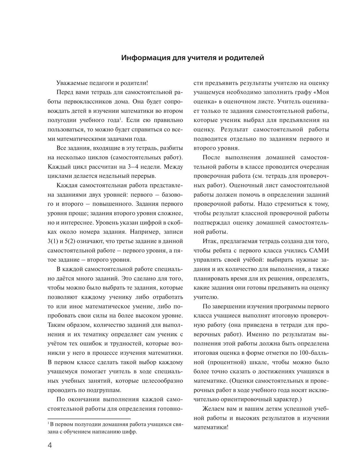 В тетради представлены задания для организации самостоятельной работы учащихся на протяжении всего учебного года. Включены задания двух уровней, позволяющие учащимся как отработать то или иное умение на базовом уровне, так и попробовать свои силы в решении более трудных задач. Работа с тетрадью научит детей самостоятельно выбирать задания, планировать время для их выполнения, определять готовность к предъявлению результатов работы учителю.