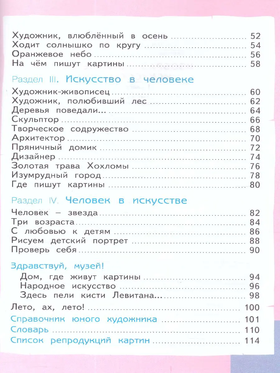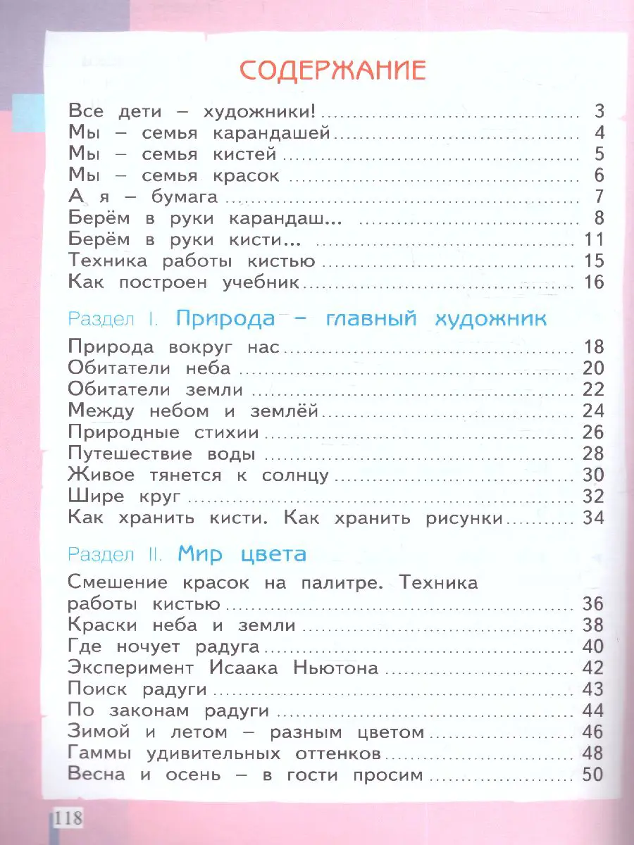 Содержание учебника направлено на развитие воображения, наблюдательности, творческого потенциала ребенка, формирование у него художественного взгляда на окружающий мир. Учащиеся знакомятся с начальными понятиями изобразительного искусства, творчеством лучших русских и зарубежных художников. Большое внимание в учебнике уделено приобретению школьниками первоначальных навыков работы в различных видах художественно-творческой деятельности, пробуждению интереса к рисованию.