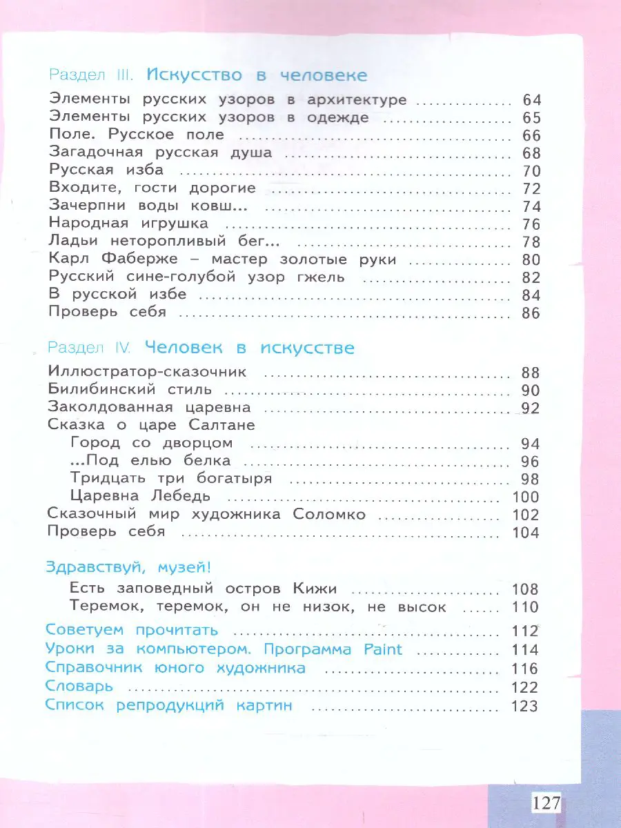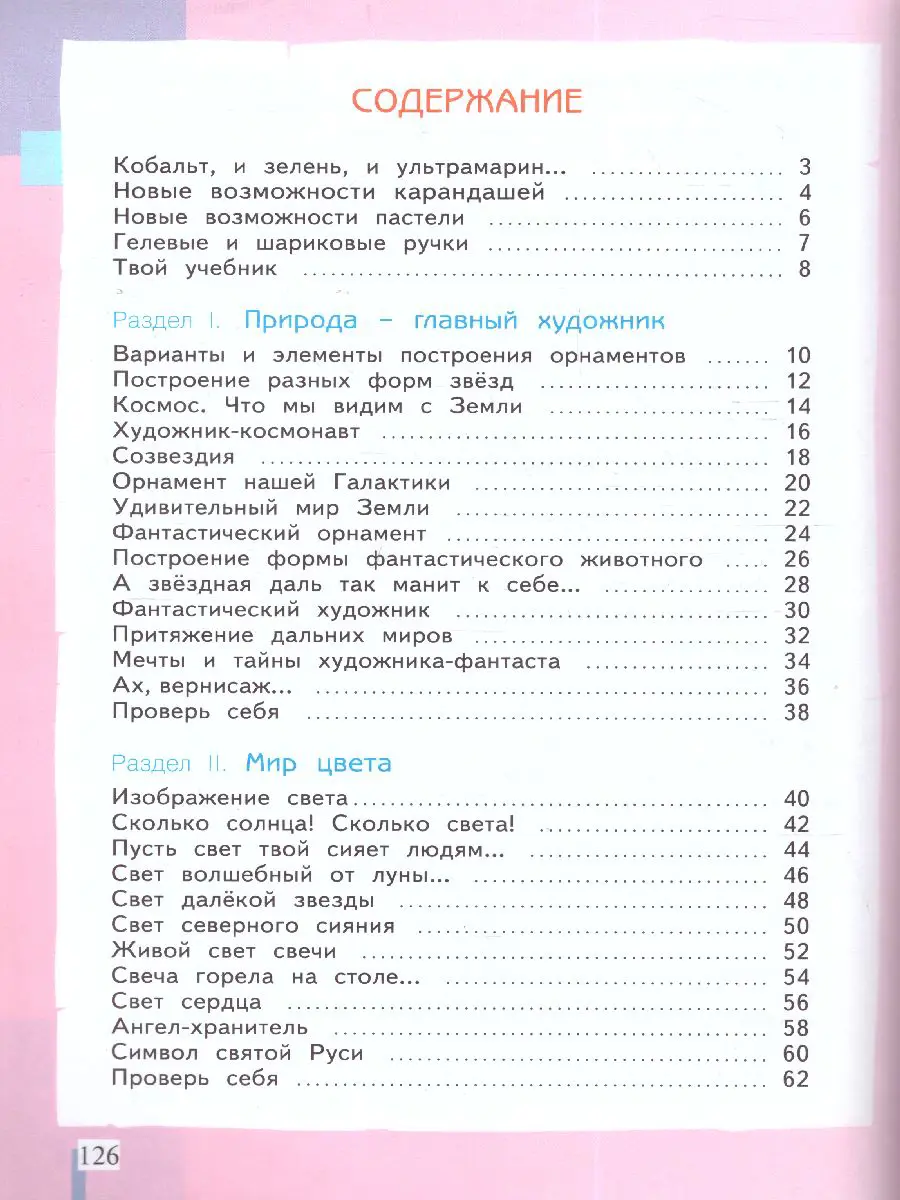 Содержание учебника направлено на развитие воображения, наблюдательности, творческого потенциала ребенка, формирование у него художественного взгляда на окружающий мир. Учащиеся знакомятся с начальными понятиями изобразительного искусства, творчеством лучших русских и зарубежных художников. Большое внимание в учебнике уделено приобретению школьниками первоначальных навыков работы в различных видах художественно-творческой деятельности, пробуждению интереса к рисованию.