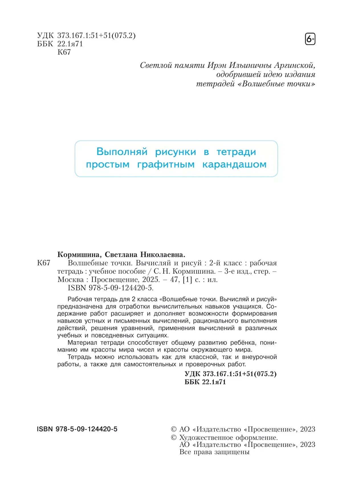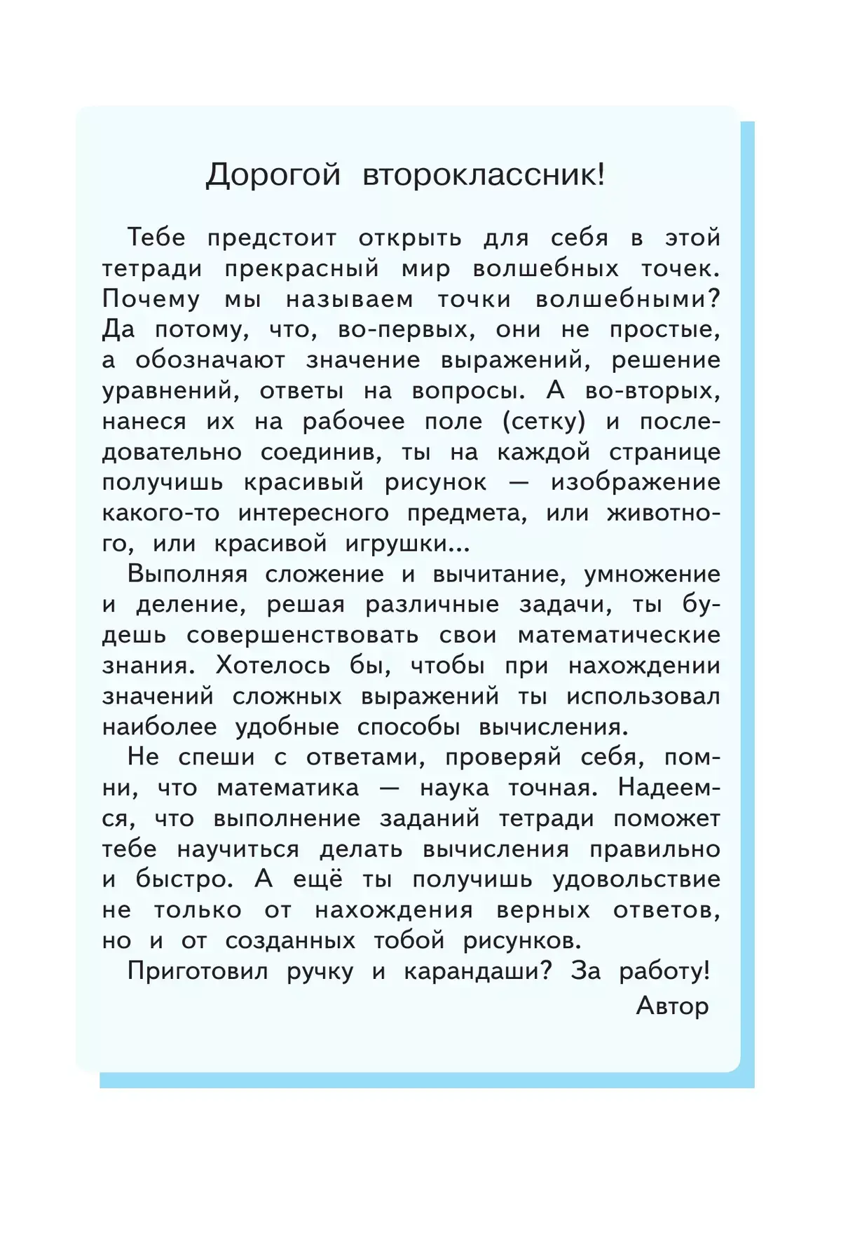 Рабочая тетрадь для 2 класса «Волшебные точки. Вычисляй и рисуй» предназначена для отработки вычислительных навыков учащихся. Содержание работ расширяет и дополняет возможности формирования навыков устных и письменных вычислений, рационального выполнения действий, решения уравнений, применения вычислений в различных учебных и повседневных ситуациях.