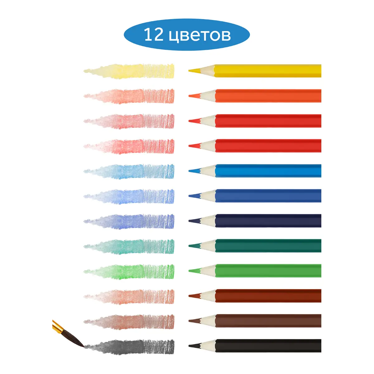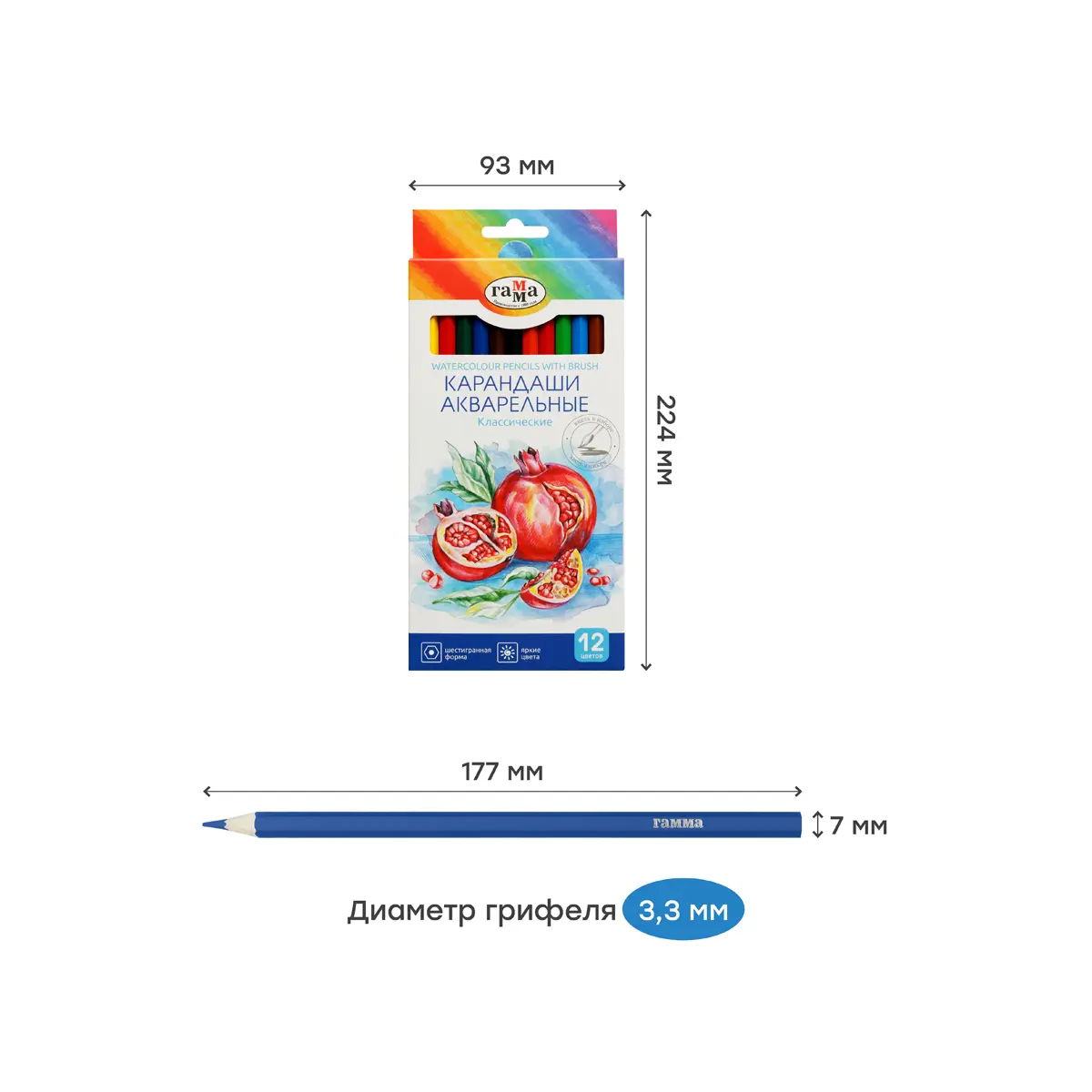 Цветные акварельные карандаши ГАММА серии «Классическая» созданы специально для детей, которые уже чувствуют себя настоящими художниками. В наборе 12 ярких и насыщенных цветов: зелёный, красный, бордовый, синий, жёлтый, чёрный, коричневый, голубой, фиолетовый, оранжевый, салатовый, красно-коричневый. Увеличенный диаметр грифеля – 3,3 мм. Акварельные карандаши «Классические» обладают свойствами цветных карандашей и акварели. Благодаря водорастворимому связующему в составе они отличаются хорошей размываемостью. Тонкотертые пигменты обеспечивают чистые, насыщенные и равномерные цвета. Шестигранный корпус карандаша диаметром 7 мм и длиной 174 мм изготовлен из древесины специальной обработки, и его легко точить. В комплекте – высококачественная кисть «ГАММА» из синтетического волоса. Представлены в удобной упаковке в креативном дизайне. Количество цветов: 12. Форма корпуса: шестигранная. Заточка грифеля: да. Количество карандашей: 12.