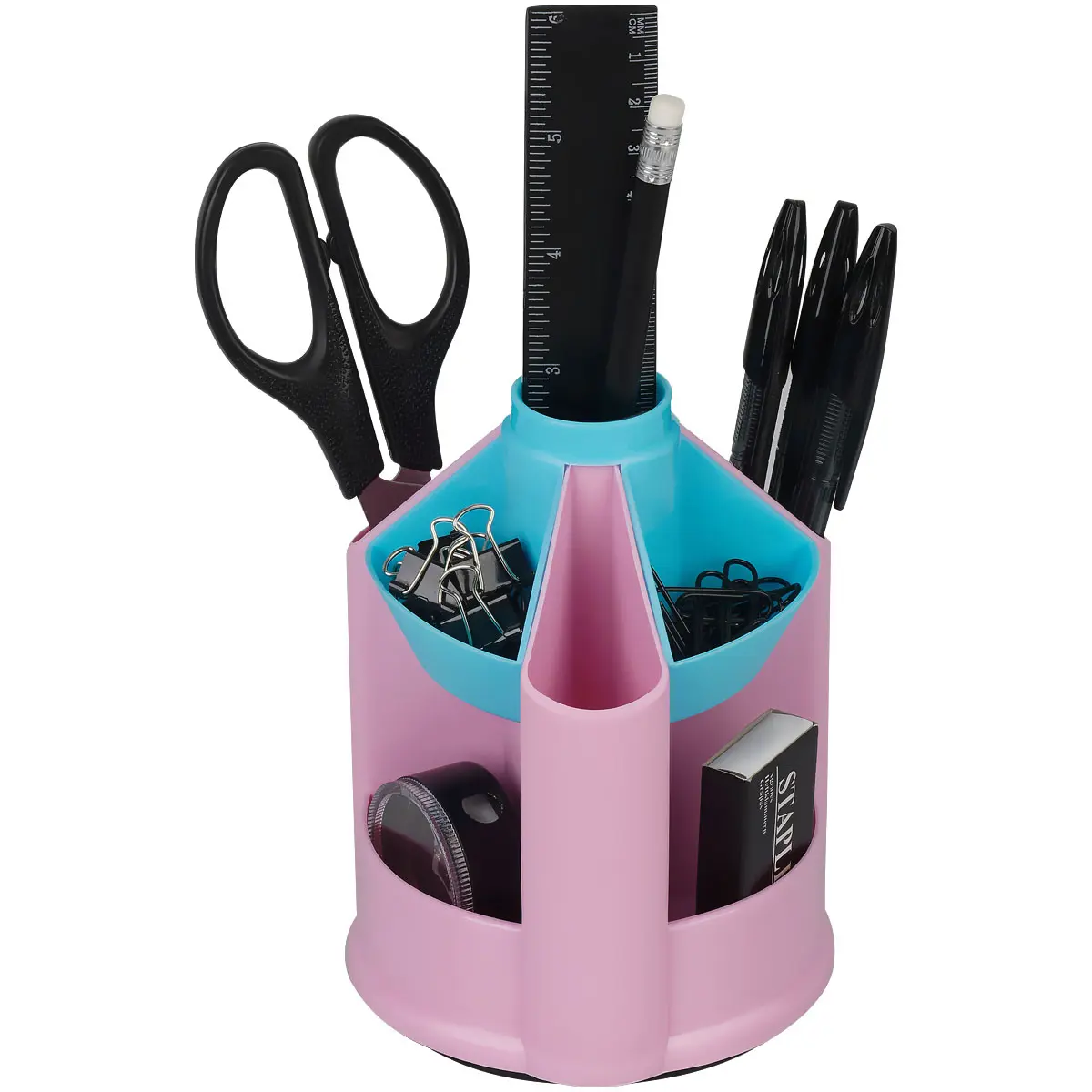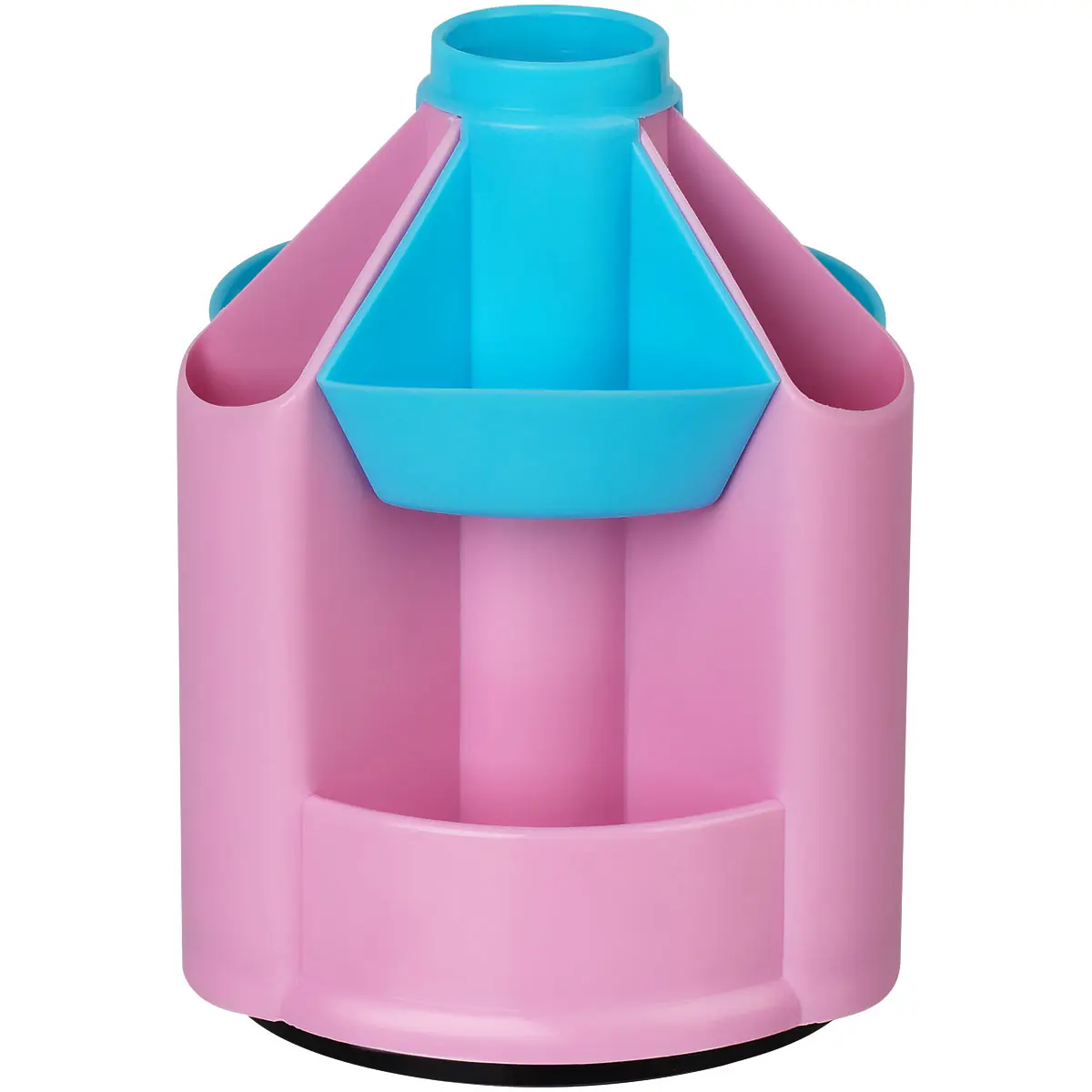 Настольная подставка "СТАММ" серии "Mini Desk" предназначена для хранения канцелярских принадлежностей. Вместительная и устойчивая подставка имеет 10 отделений разной высоты и формы. Изделие высотой 13,5 см и основанием 10,5*10,5 см изготовлено из качественного пластика. Свободно вращается на 360 градусов. Поставляется без наполнения. Цвет изделия - розовый/бирюзовый.
