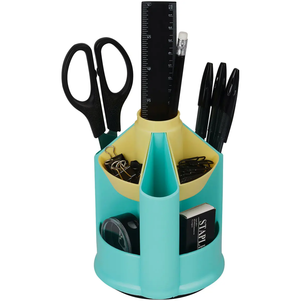 Настольная подставка "СТАММ" серии "Mini Desk" предназначена для хранения канцелярских принадлежностей. Вместительная и устойчивая подставка имеет 10 отделений разной высоты и формы. Изделие высотой 13,5 см и основанием 10,5*10,5 см изготовлено из качественного пластика. Свободно вращается на 360 градусов. Поставляется без наполнения. Цвет изделия - мятный/желтый.