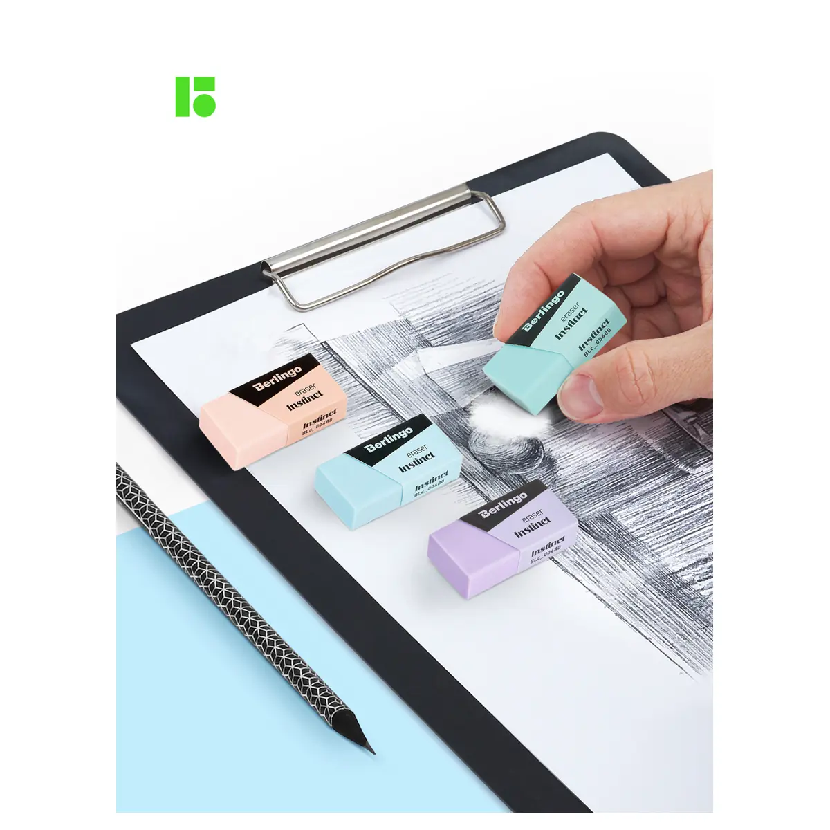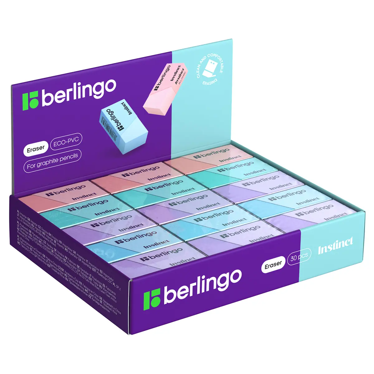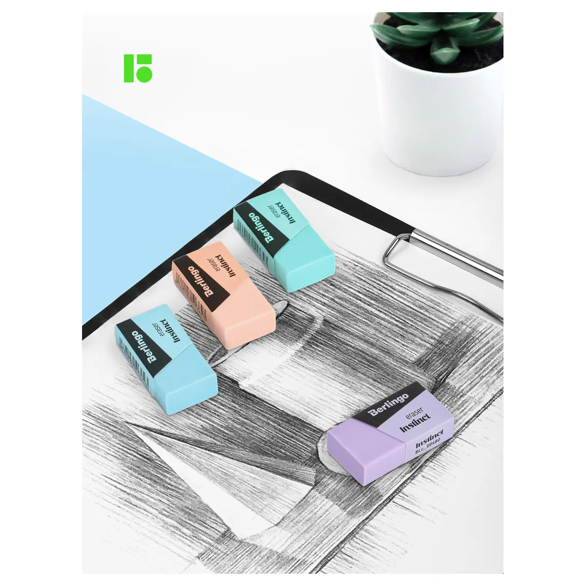 Ластик выполнен в стиле коллекции Berlingo "Instinct". Пастельные цвета в сочетании с черным: розовый, лаванда, мятный, аквамарин. Ластики выполнены из Eco-Pvc. Не токсичны, не содержат вредных компонентов и фталатов. Прекрасно справляются с линиями от чернографитного карандаша, не оставляют следов и грязных разводов после себя. Упакованы в картонные дисплей-боксы. У каждого ластика есть штрих-код. 4 цвета ассорти.