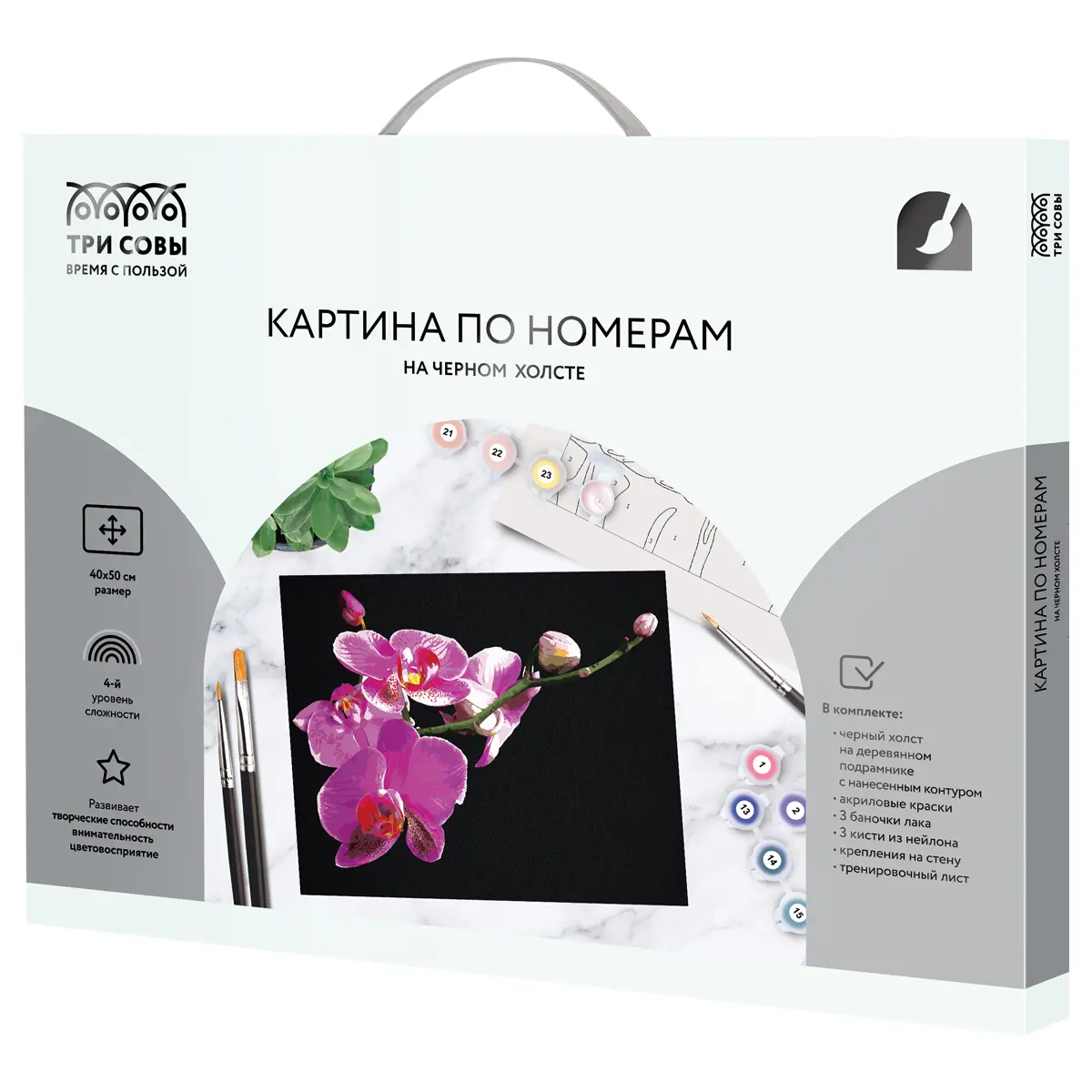 Картина по номерам на чёрном холсте «ТРИ СОВЫ» это необычный способ попробовать свои силы в живописи. Данный метод рисования способствует развитию внимания и концентрации, аккуратности, пониманию концепции построения фигуры через цветовые оттенки, развивает чувство вкуса, а также помогает снять стресс, тревогу и напряжение. Холст чёрного цвета в картинах по номерам привносит неповторимый эффект и оригинальность в работу. Законченная картина порадует яркими и контрастными цветами. В набор входят: 1) чёрный холст на деревянном подрамнике 40*50 см с контуром, нанесённым на часть холста и пронумерованным в соответствии с красками. Технология точной разбивки сюжета картины на разные цветовые оттенки гарантирует правильность исполнения полотна; 2) акриловые краски с высокой укрывистостью на водной основе в пронумерованных баночках; 3) 3 баночки с глянцевым защитным лаком; 4) 3 кисти из эластичного нейлонового волокна; 5) крепления на стену; 6) тренировочный лист. Набор упакован в стильную подарочную коробку с пластиковой ручкой, поэтому ее приятно преподнести в качестве оригинального подарка близкому человеку. Картины по номерам «ТРИ СОВЫ» вдохновят и помогут раскрыть творческие способности и сделает вас ближе к изобразительному искусству. Художником может быть каждый! Мы надеемся, что процесс рисования доставит вам большое эстетическое удовольствие, и созданные своими руками картины украсят интерьер дома или станут прекрасным подарком. «ТРИ СОВЫ» – время с пользой! Тематика - цветы; уровень сложности - 4.