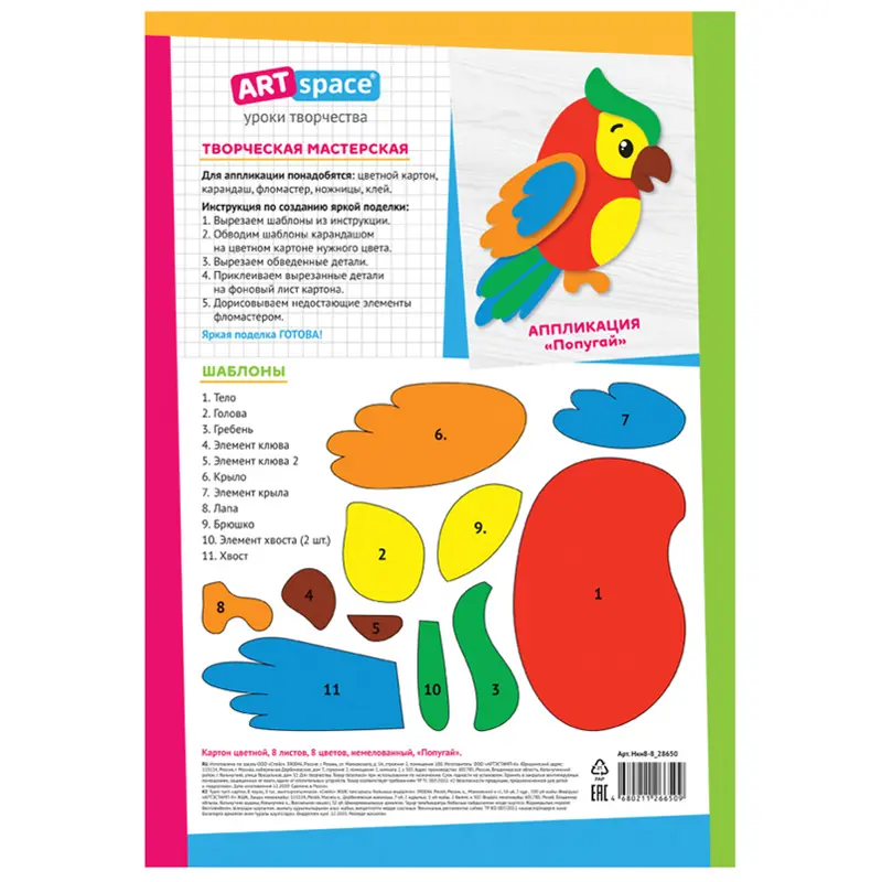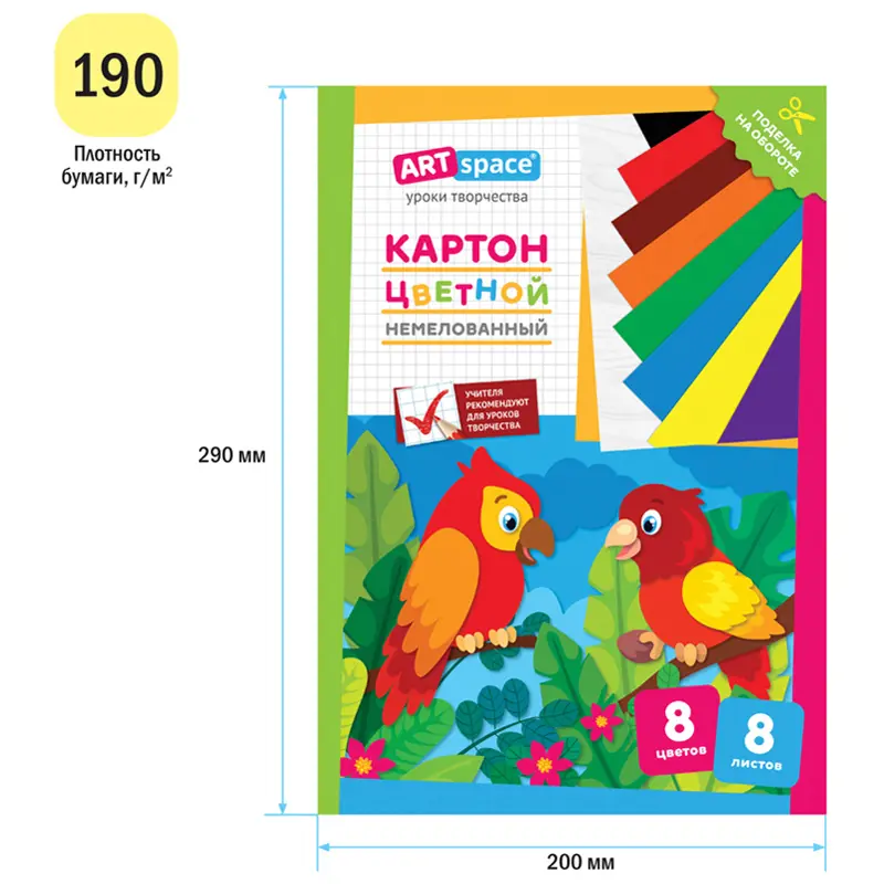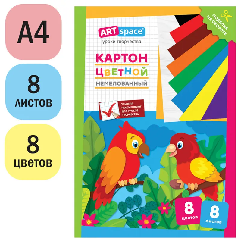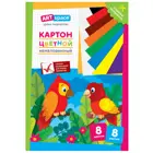 Картон цветной, А4, 8 л., 8 цв., немелованный, односторонний, 190г/м2, в папке. Попугай