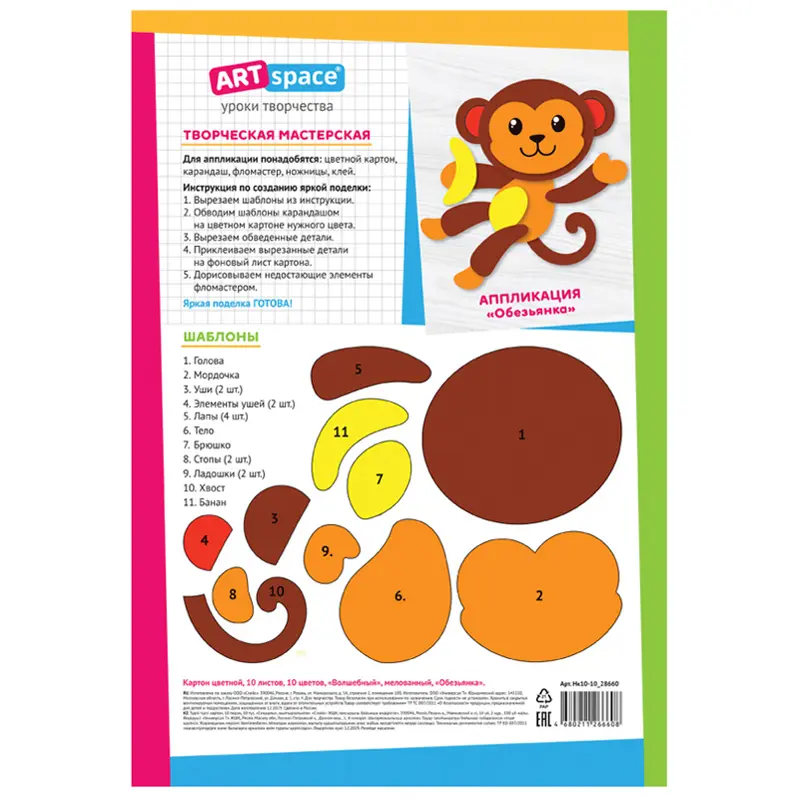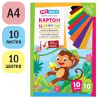 Картон цветной, А4, 10 л., 10 цв., мелованный, односторонний, в папке. Волшебный. Обезьянка