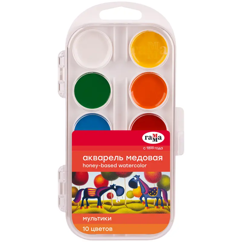 Акварель медовая. Гамма "Мультики". 10 цветов, б/кисти, пластиковый корпус