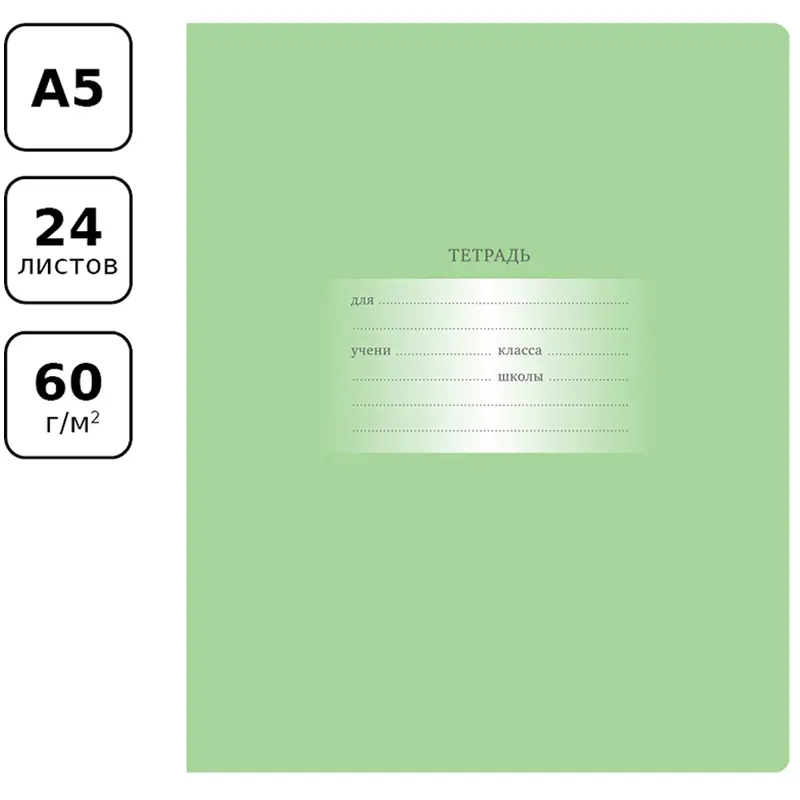 Тетрадь 24 листа, клетка, обложка мелованный картон. "Первоклассная". Светло-зеленая. (12 шт.)