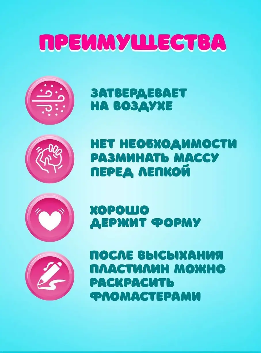 В набор входит масса аксессуаров для увлекательного вреяпрепровождения.Воздушный пластилин начинает через 1-2 часа застывать на воздухе.После высыхания становится очень, очень легкм.